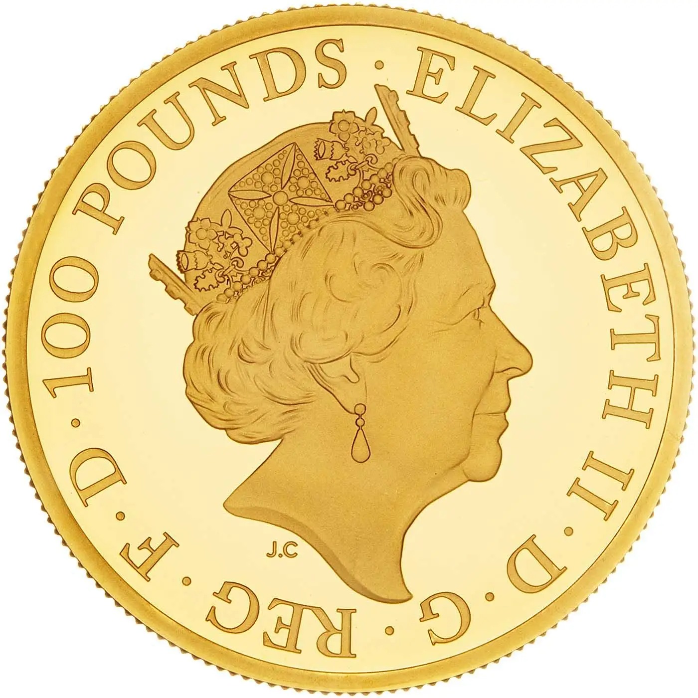 The obverse of this Queen’s Beasts coin features Jody Clark‘s fifth definitive effigy of Queen Elizabeth II, accompanied by the surrounding inscription: ‘ELIZABETH II · D · G · REG · F · D · 100 POUNDS ·’.