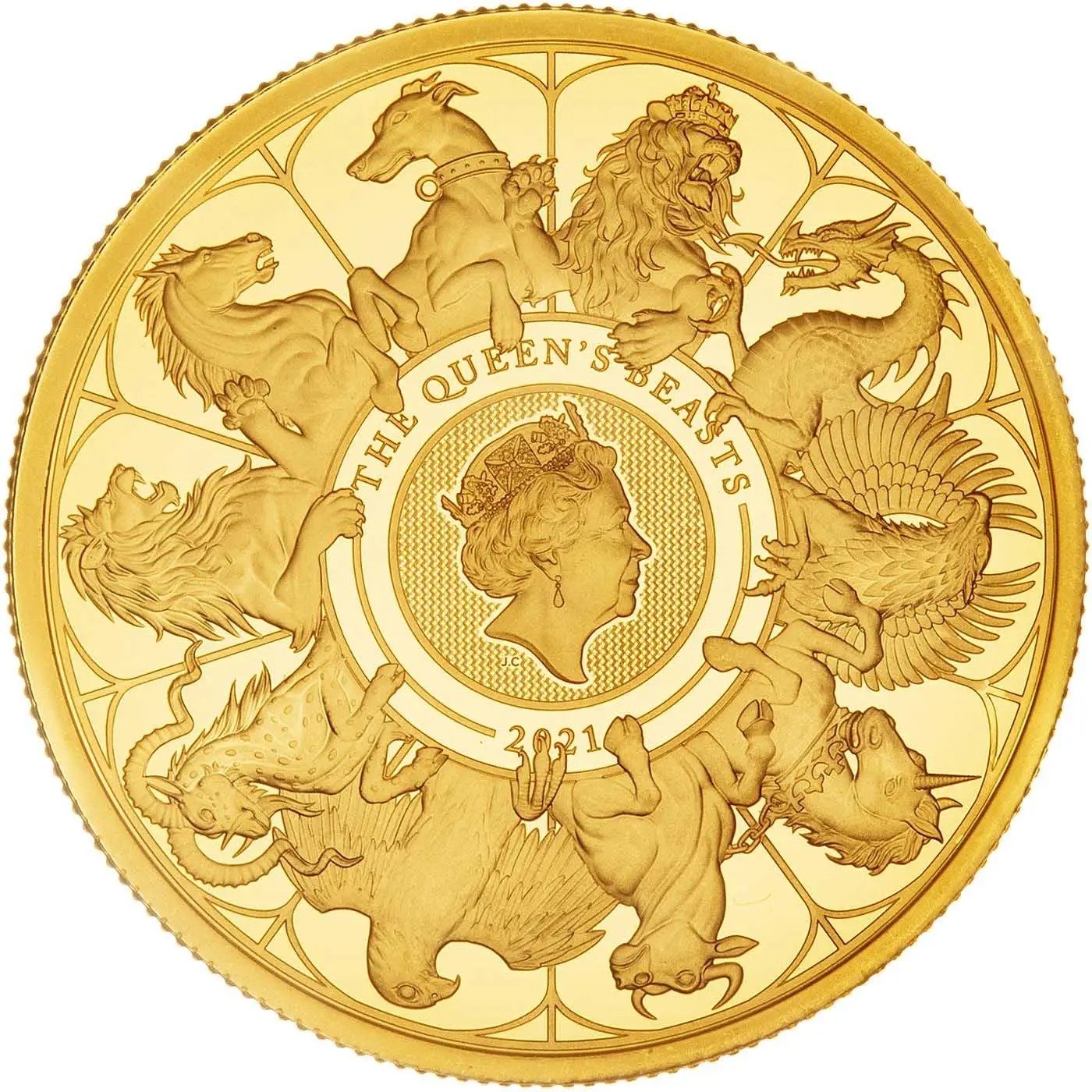 On the reverse, Clark combines all ten beasts from the series, from the Lion of England to the Griffin of Edward III, arranged in a circular design around a portrait of the Queen. The inscription reads ‘THE QUEEN’S BEASTS’ with the year (2021) below.