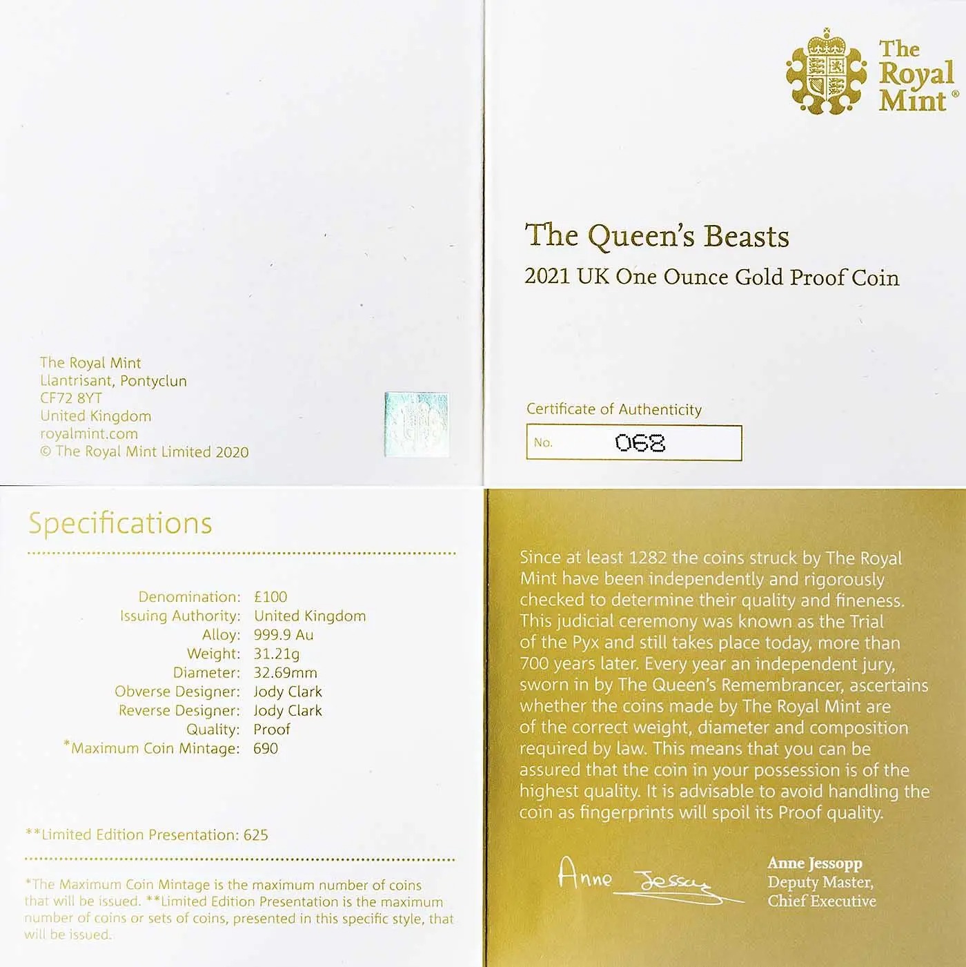 This £100 coin is struck in one troy ounce of 24-carat (999.9) gold and measures 32.69 millimetres from milled edge to milled edge. Its flawless proof finish is created by multiple strikes of hand-prepared dies, producing frosted reliefs over polished backgrounds.
