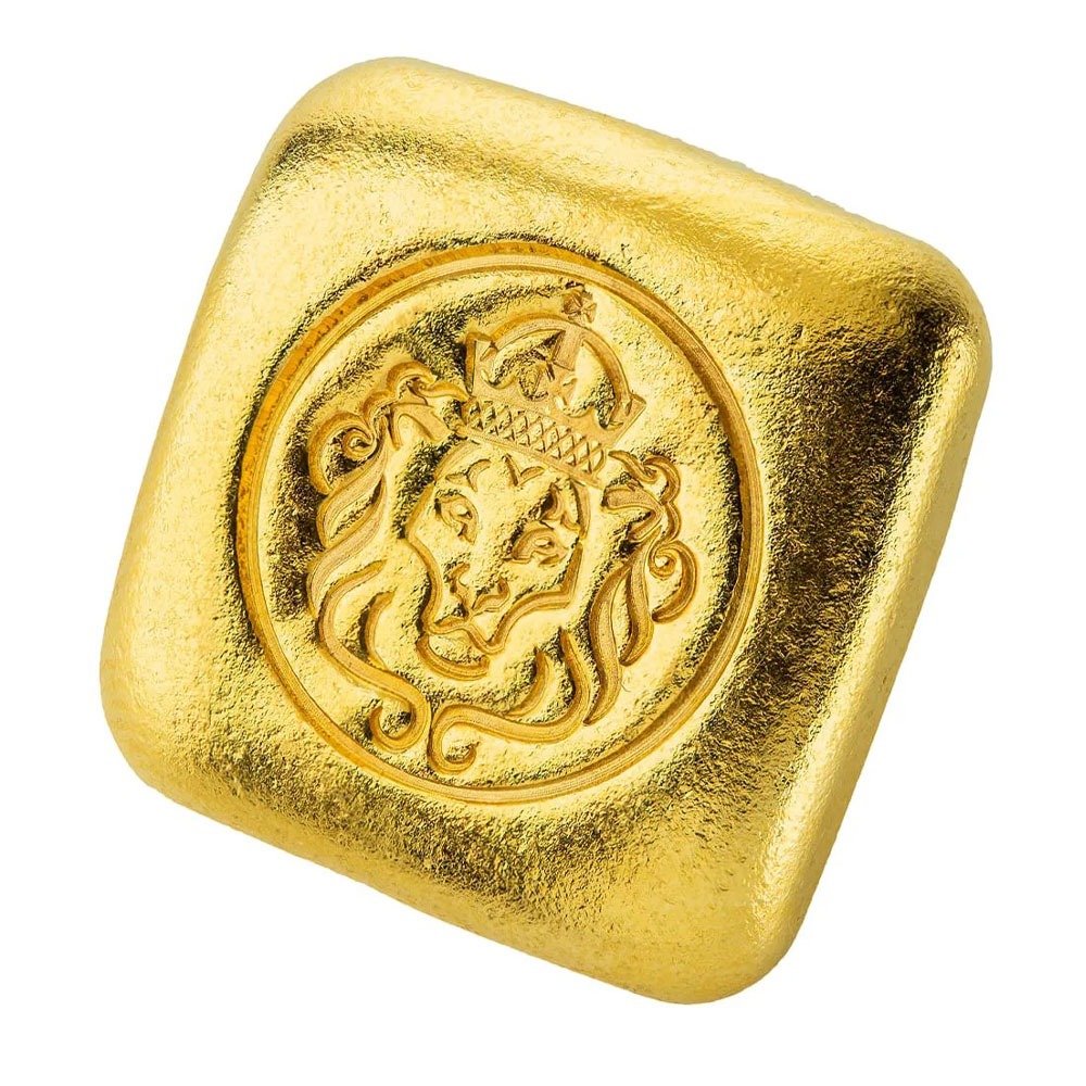 The obverse of the 1 oz Scottsdale Mint Cast Gold Bar includes the crowned Scottsdale Lion in the center. The reverse surface has inscriptions of the weight, purity, and metal content.
