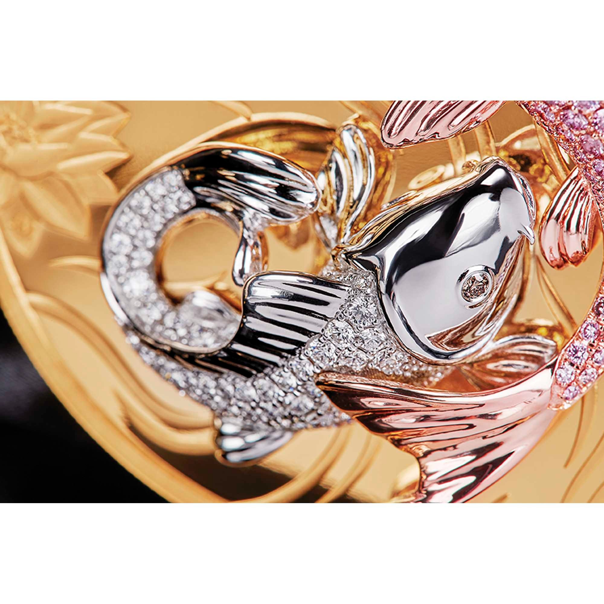 - Three-dimensional koi crafted in 18-carat rose and white gold