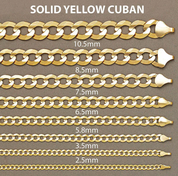 Solid Yellow Cuban Chain | 10K Yellow Gold. These chains are fully customizable, so you can pick your length and width above. Once you selected your length and width, you can see the adjusted gram weight below the price.