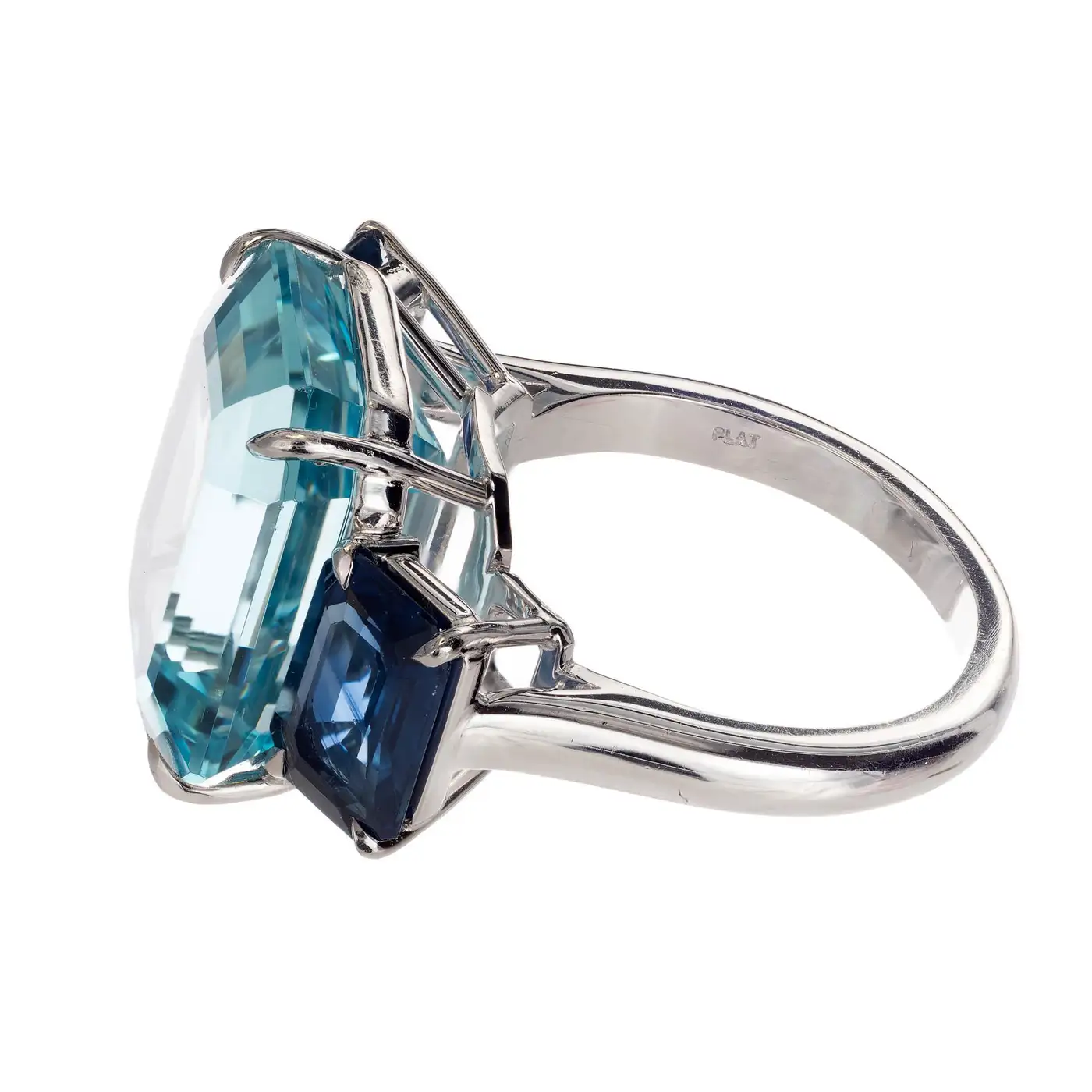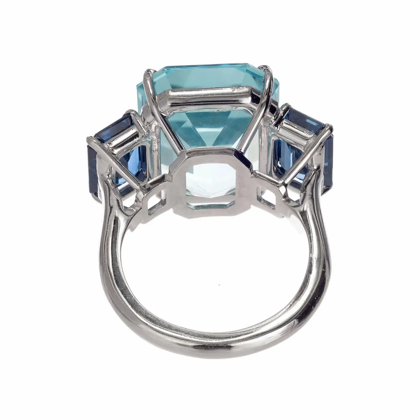 1 natural Emerald cut untreated natural bright greenish blue Aqua, approx. total weight 13.60cts, VS, 16.6 x 13.4mm 2 Emerald cut bright clear blue Sapphires, approx. total weight 3.50cts, VS, 9.2 x 6.2mm Size 6.50+ and sizable Tested: Platinum Stamped: Plat 13.5 grammes Width at top: 16.6mm Height at top: 10mm Width at Bottom: 2.5mm.