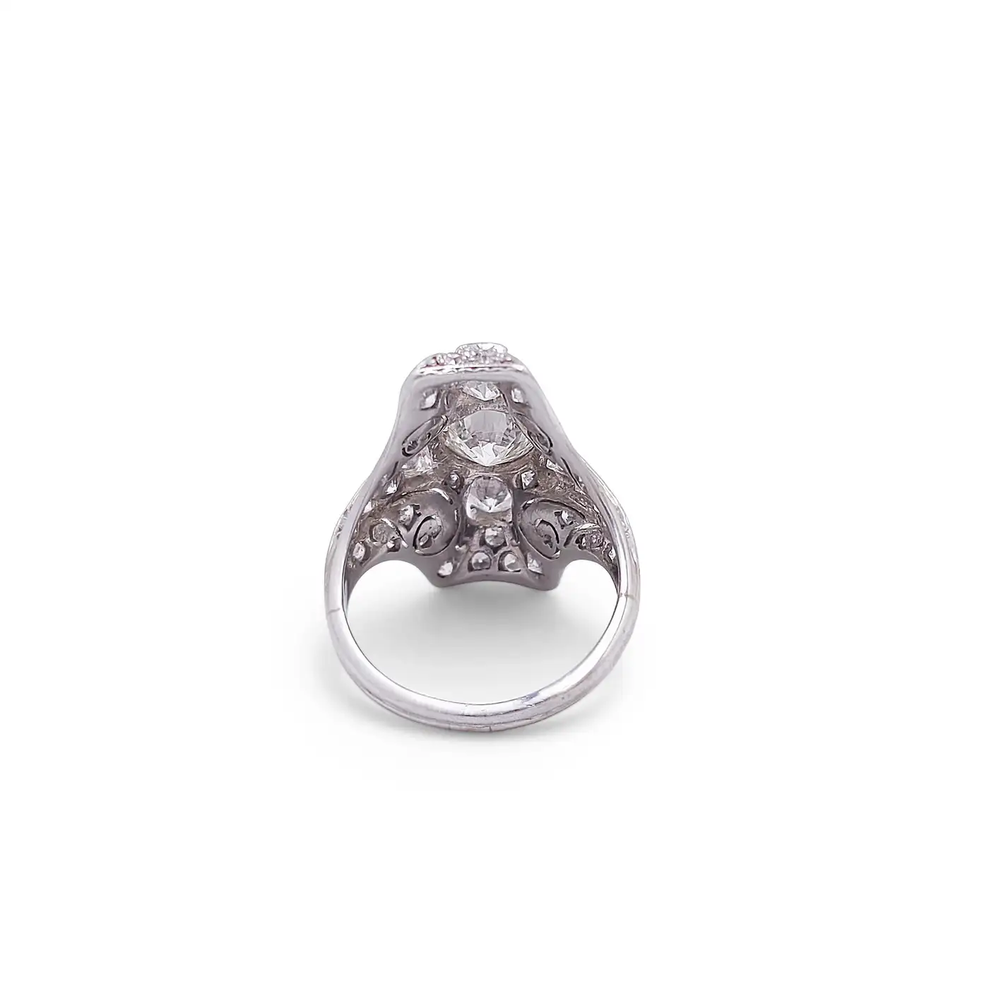 A gorgeous 1930s Art Deco ring crafted in platinum and featuring three sparkling Old European cut diamonds. The centre stone is approximately 0.82 carats (I-J colour, VS2/SI1 clarity). The stunning centre stone is flanked by two additional diamonds weighing approximately 0.39ct and 0.37ct respectively (H-I colour, VS2/SI1 clarity). Set in a charming hand carved filigree mounting with fine milgrain detail and accented by approximately 0.60 total carats of round and single cut diamonds to complete this stunning design. Size 5 3/4. CIRCA 1930s