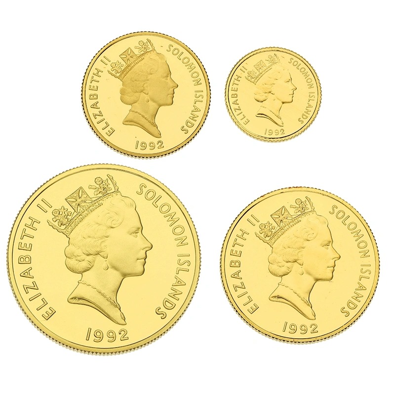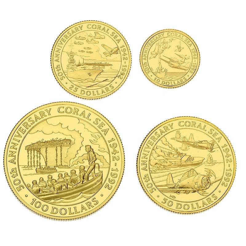 A four coin proof set issued by the Royal Mint for the Solomon Islands to commemorate the 50th anniversary of the Battle of the Coral Sea. It features 1oz, 1/2oz, 1/4oz, 1/10oz coins. Limited to 500 sets. Boxed with certificate.