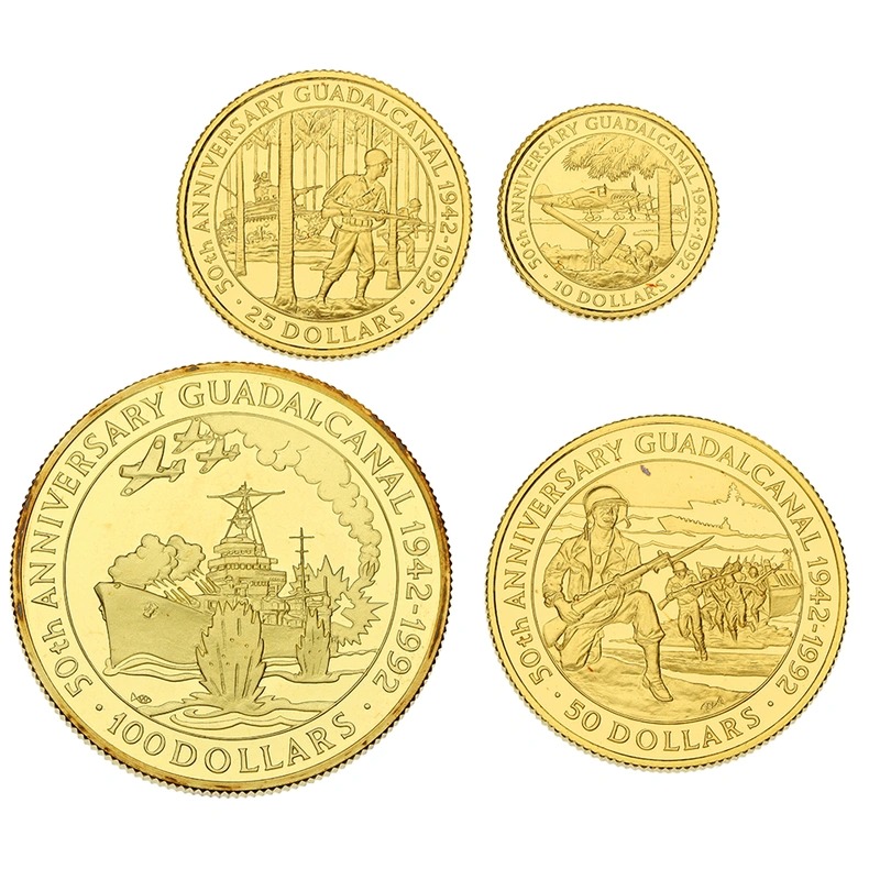 A four coin proof set issued by the Royal Mint for the Solomon Islands to commemorate the 50th anniversary of the Battle of Guadalcanal. It features 1oz, 1/2oz, 1/4oz, 1/10oz coins. Limited to 500 sets. Boxed with certificate.