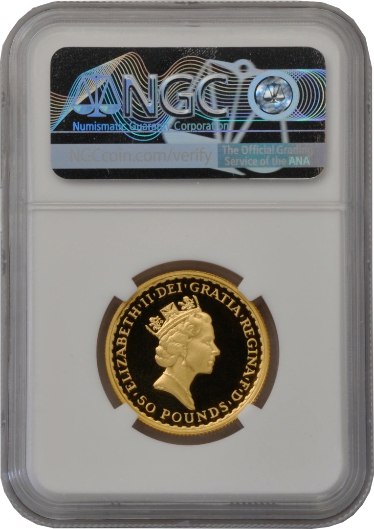 A 1993 Britannia proof gold half ounce coin graded by the Numismatic Guaranty Corporation (NGC) to