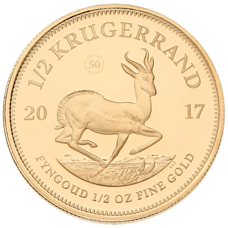 A 2017 half-ounce proof gold Krugerrand. The coin is in mint condition and supplied in an attractive box with certificate from the South African Mint. The half-ounce gold Krugerrand is a 22-carat gold coin, but weighs slightly above half an ounce meaning it contains exactly half an ounce of pure gold.