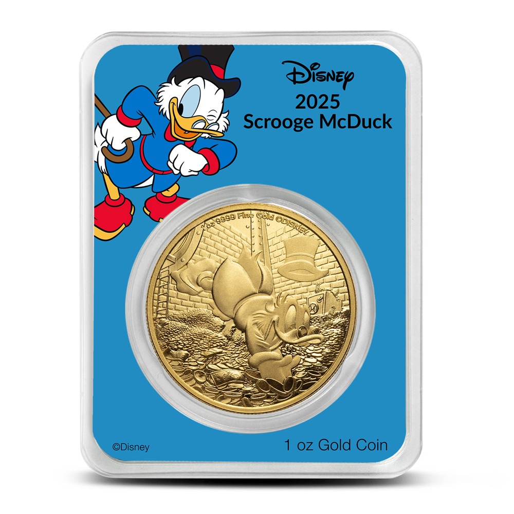 Scrooge McDuck was created by legendary Disney cartoonist Carl Barks in 1947, making his debut in the Donald Duck story “Christmas on Bear Mountain.” Barks drew inspiration from Charles Dickens’ miserly character Ebenezer Scrooge, but transformed him into Donald Duck’s wealthy Scottish uncle with a more adventurous and complex personality. Right now, 2025 1 oz Niue Scrooge McDuck Gold Coins are available.