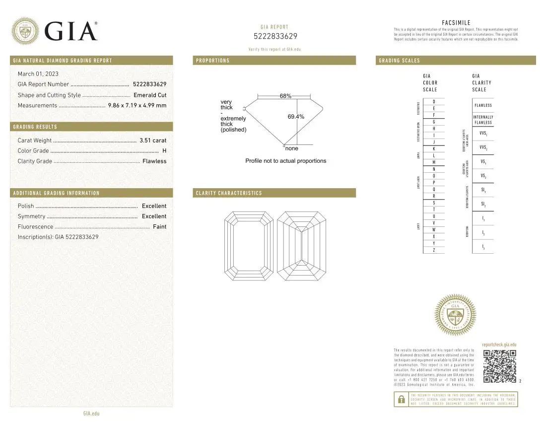 3.51 Carat Emerald Cut Diamond Ring H Colour GIA Certified