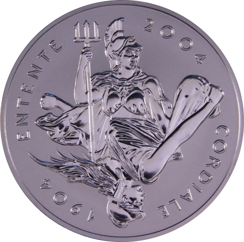 Here we have a beautiful 2004 3oz (actually 3.02 oz or 94.2g) Piedfort Proof Crown from The Royal Mint. Issued in 2004, it celebrates 100 years of the Entente Cordiale agreed in 1904. Piedfort coins are double thickness and it is impressively thick. Supplied in a Royal Mint box with certificate. Issue limit of 501 coins.