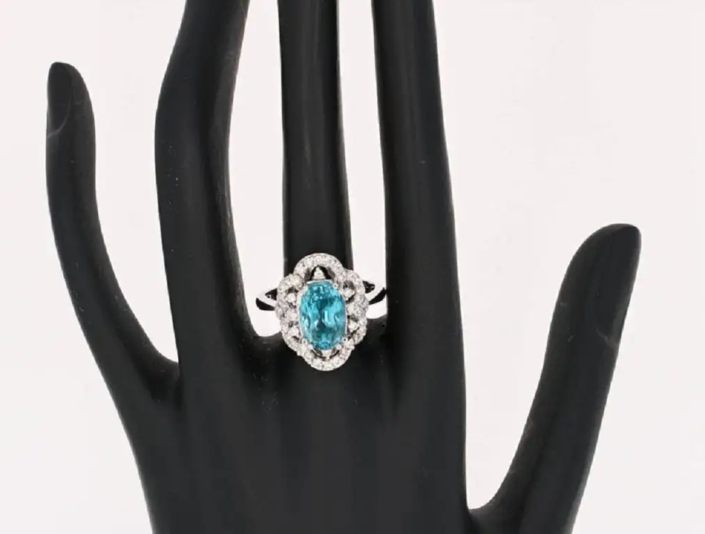 Dazzling Blue Zircon and Diamond Ring! Blue Zircon is a natural stone mined in different parts of the world, mainly Sri Lanka, Myanmar, and Australia. This Oval Cut Blue Zircon is 5.49 carats surrounded by 40 Round Cut Diamonds that weigh 0.56 carats. The total carat weight of the ring is 6.05 carats. The measurements of the Blue Zircon are 7mm x 11mm. It is set in 14K White Gold weighing 4.9 grammes. The ring is a size 7 and can be resized, if needed, at no additional charge.