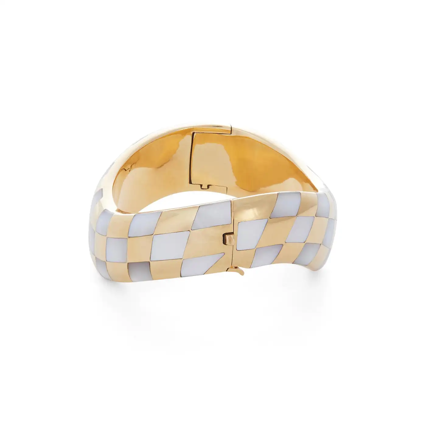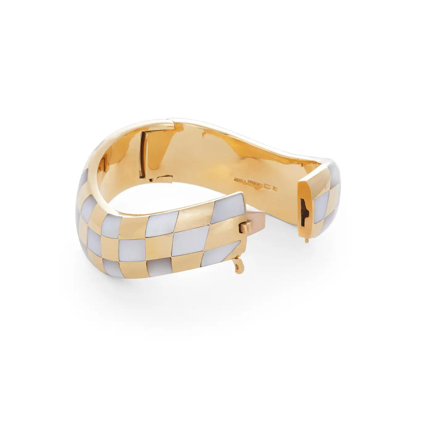 Authentic Angela Cumings bracelet crafted in 18 karat yellow gold. The asymmetric hinged bangle features inlaid mother-of-pearl in a checkerboard pattern. The bracelet measures .70 inches in width, has a 6 1/2 inch internal circumference and will fit up to a 6 1/2 inch wrist. Signed Angela Cummings, 18k, 750.