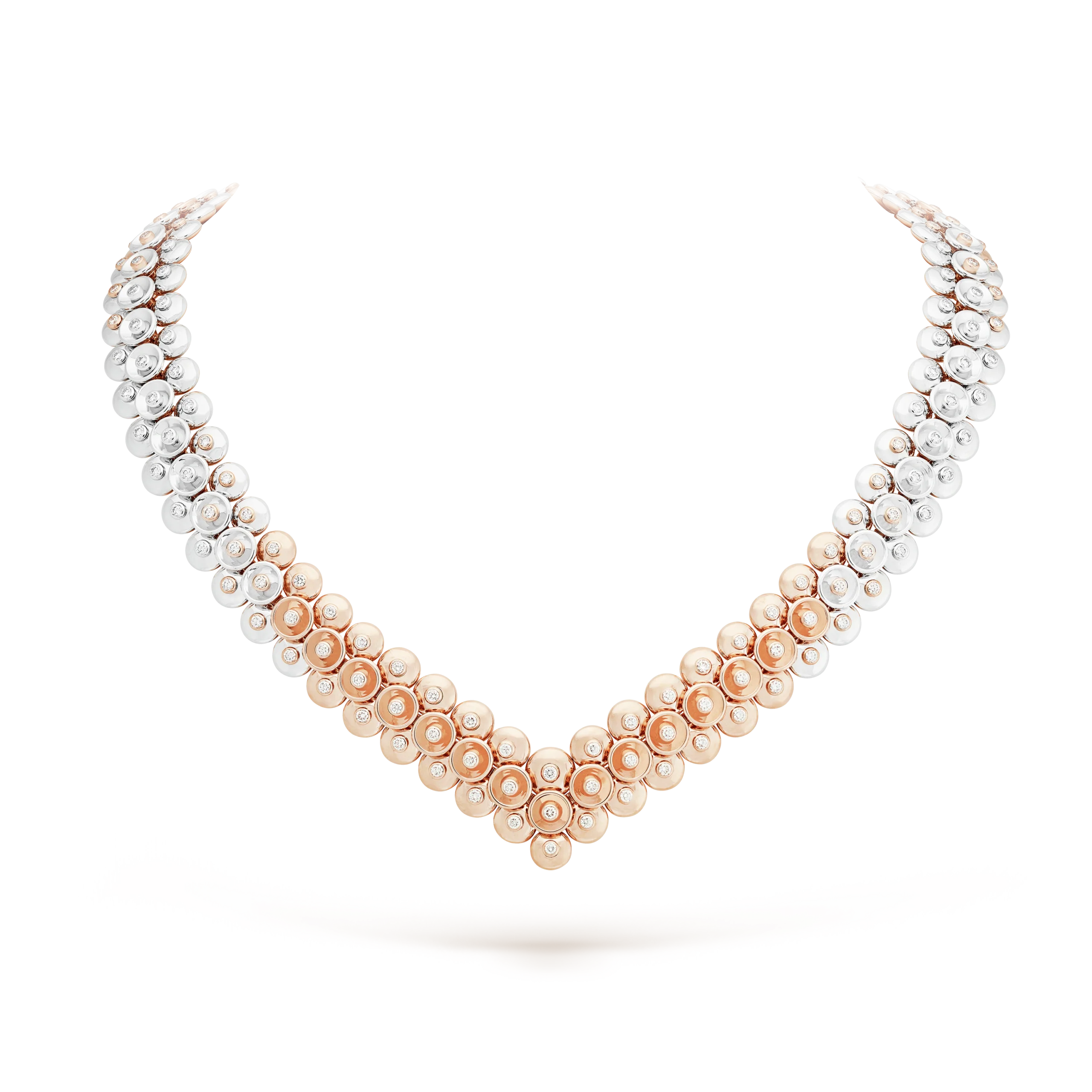 Bouton d’or necklace, 18K rose gold, rhodium plated 18K white gold and round diamonds; diamond quality DEF, IF to VVS.