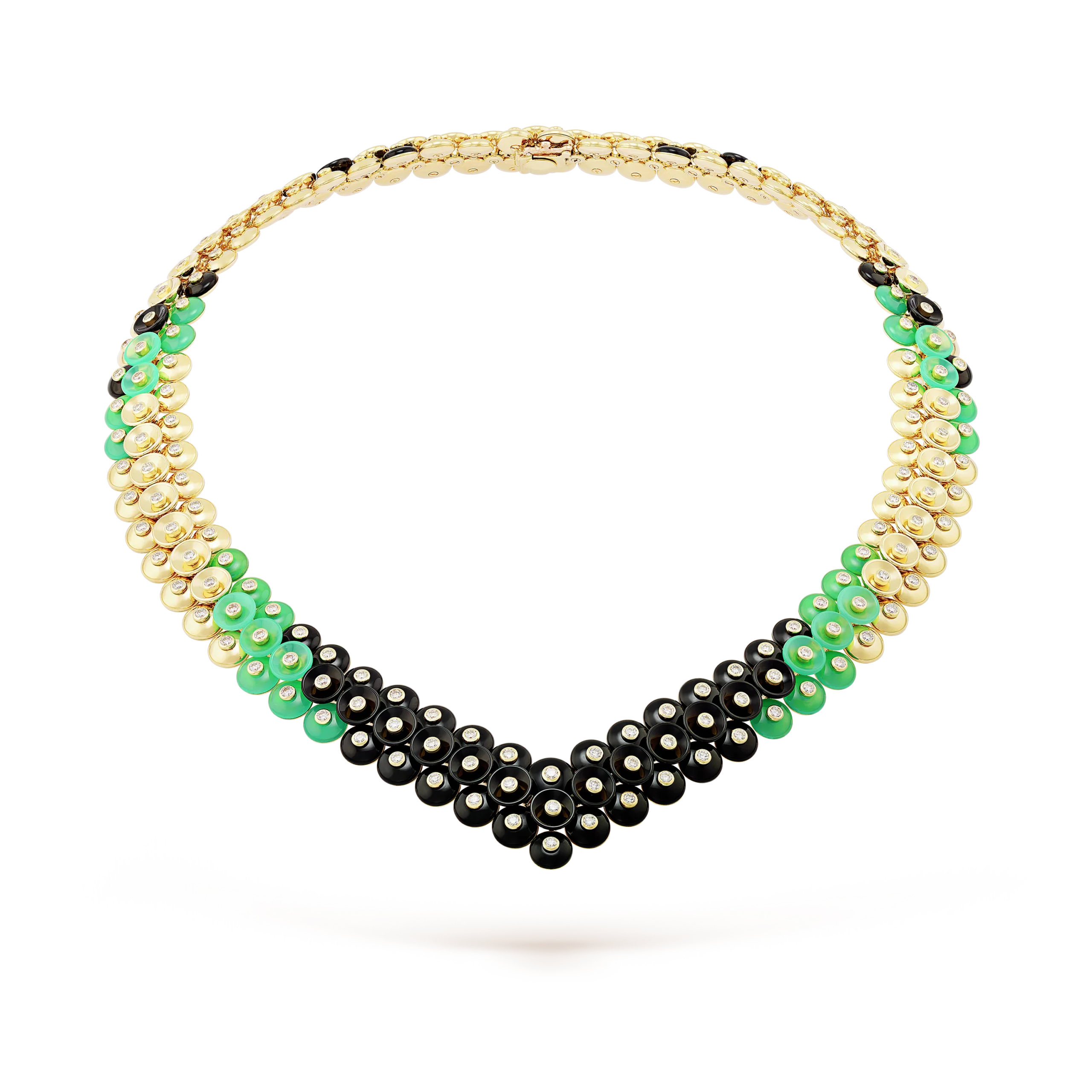 Bouton d’or necklace, 18K yellow gold, chrysoprase, onyx, round diamonds; diamond quality DEF, IF to VVS.