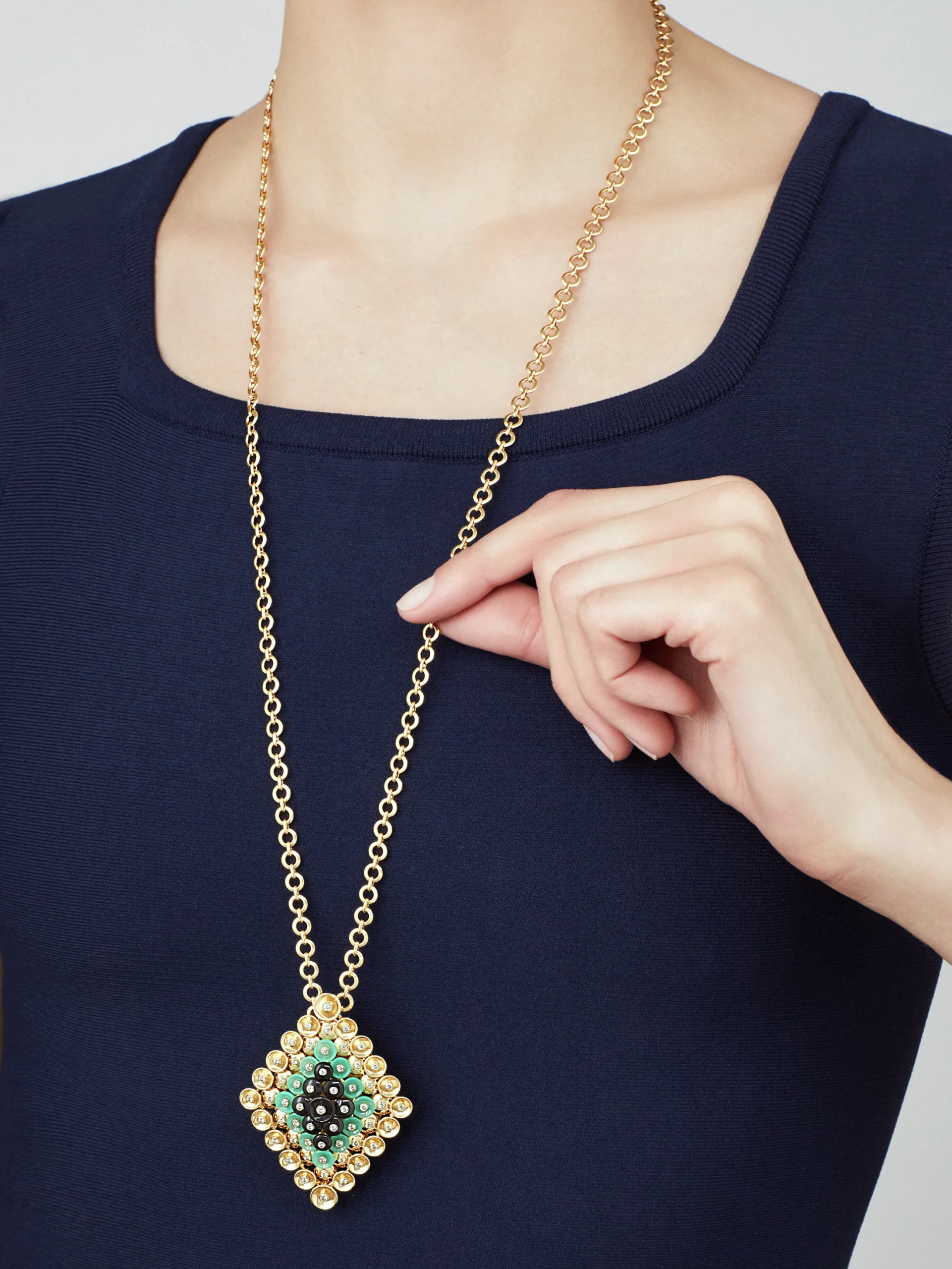 Bouton d’or pendant and detachable clip, 18K yellow gold, chrysoprase, onyx, round diamonds; diamond quality DEF, IF to VVS.