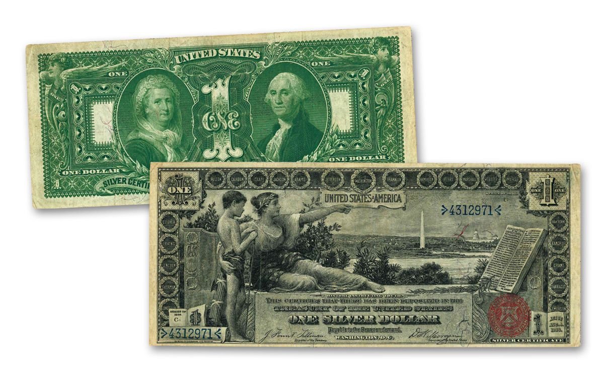 Five allegorical figures are depicted in the reverse design of 1914 $100 Federal Reserve Notes. This design featured only on this note during its large-sized issue from 1914 to 1928. It depicts male and female allegories representing Labor, Plenty, America, Peace, and Commerce.