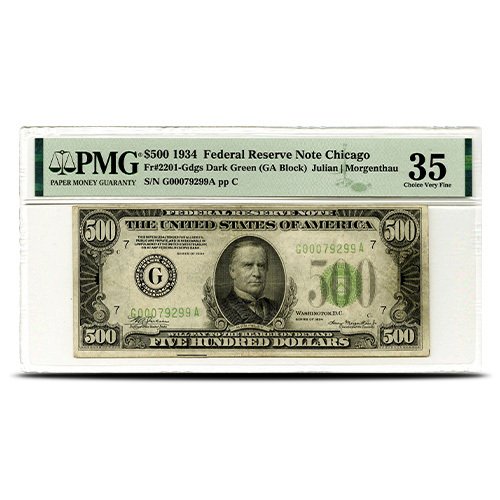 This 1934 $5,000 Federal Reserve Note is available with a grade of Choice Uncirculated 63 from the PCGS. Banknotes with this grade may have an imperfect centering on the primary design, and it is possible for several small flaws to be present. However, this note has no fold lines and good margins around the design, indicating better centering than other notes of this grade. Additionally, the note has a well-embossed design on both sides. Finally, these notes have earned a PPQ qualified from the PCGS. This stands for Premium Paper Quality, indicating the note still has vibrant ink color and good overall eye appeal.