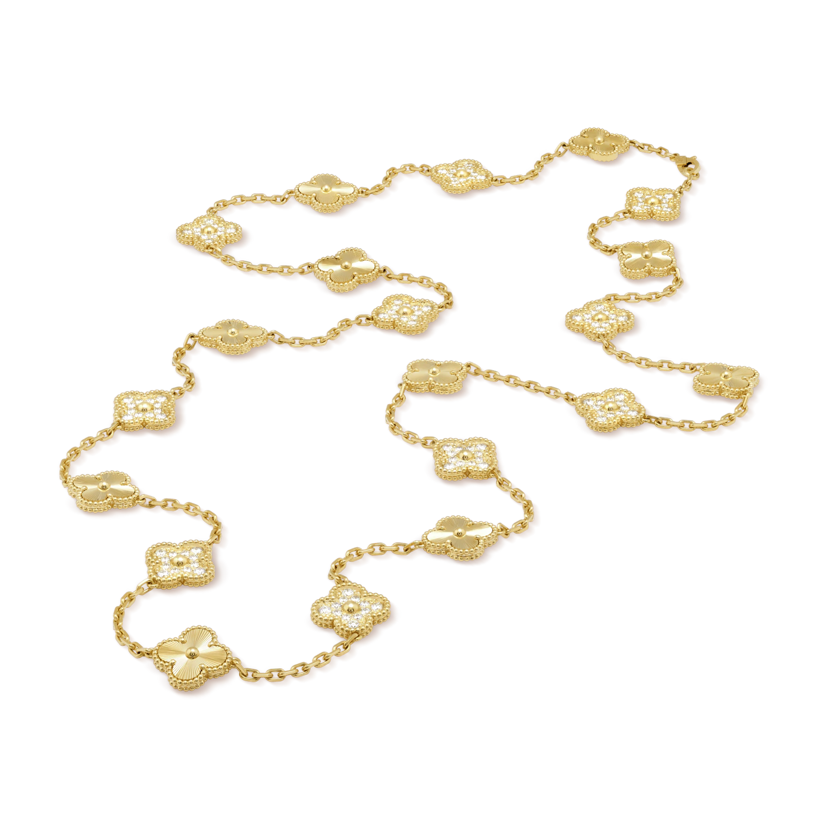 Vintage Alhambra long necklace, 20 motifs, guilloché 18K yellow gold, round diamonds; diamond quality DEF, IF to VVS.