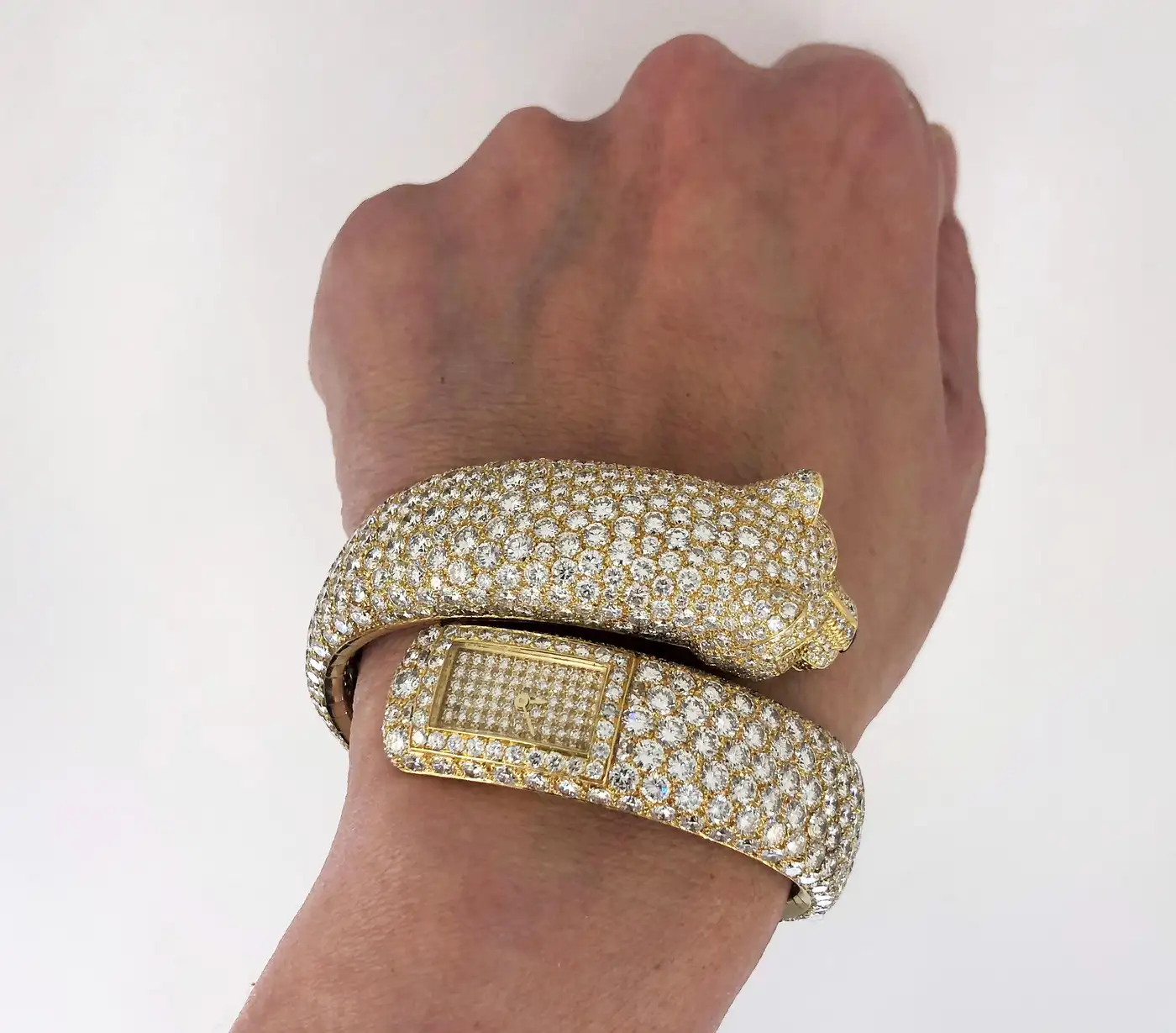Featuring Cartier’s iconic feline, rich in history and elegance, the Cartier Panther, this piece is comprised of a coiled panther head bangle, made of 18k yellow gold set with radiant diamonds throughout, striking emerald eyes, an onyx nose and rectangular diamond filled dial watch. Signed Cartier Paris.