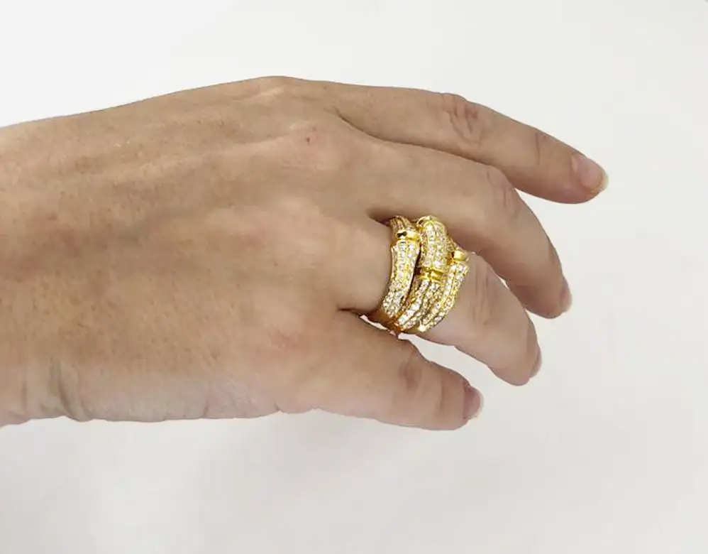 Cartier Bamboo Diamond Ring in 18k Yellow Gold. Diamond weight approx. 2.50 carats total. Measures approx. 0.65″ at widest point, tapering to 0.35″. Height is approx. 0.23″ off the finger. Currently a Size 53; can be resized although will disrupt the hallmarks and signature. Includes “750” hallmark, numbered and Signed “Cartier”; circa 1980s.