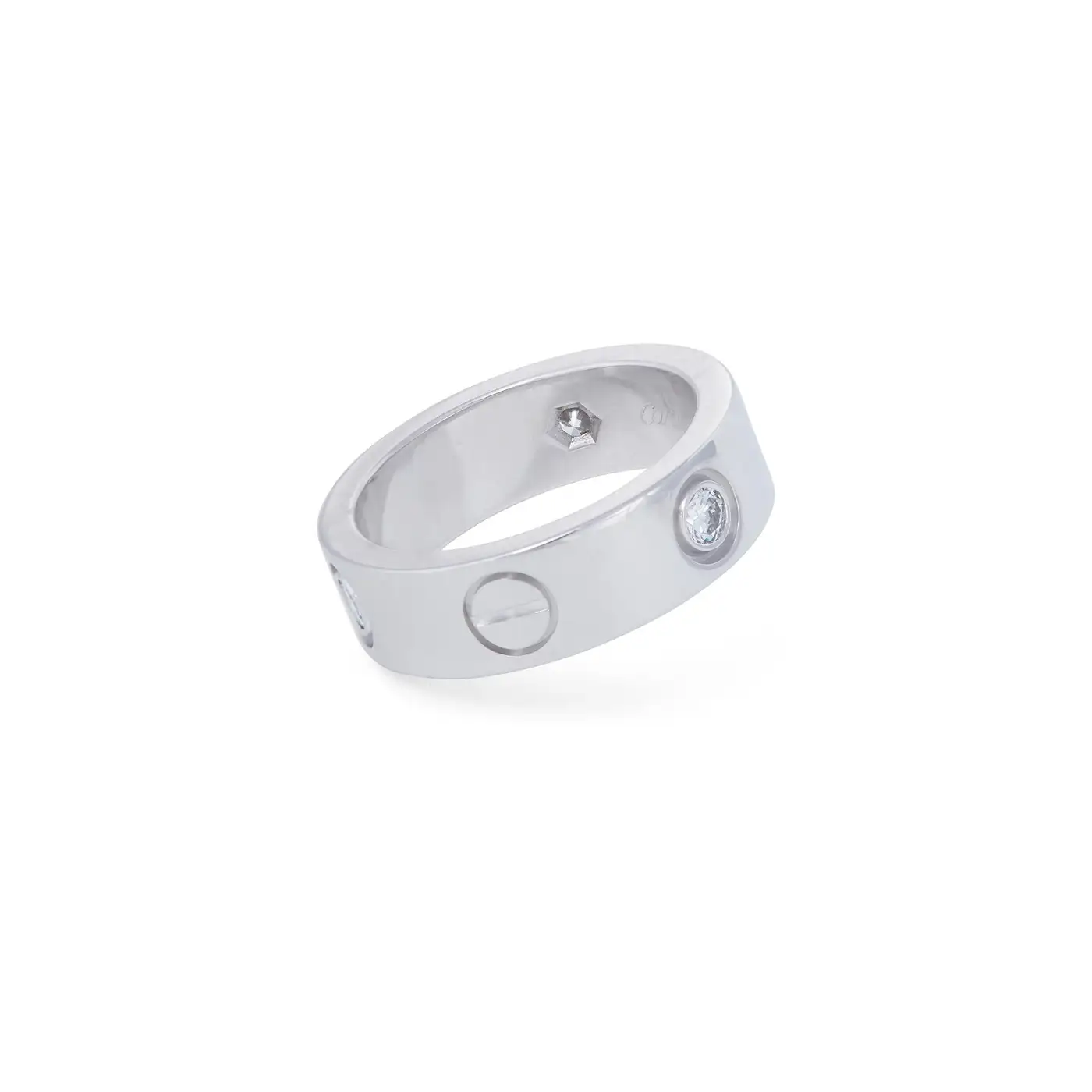 Brand: Cartier Collection: Love Metal: 18k White Gold Gemstone: Diamond Condition: Excellent Wear: Consistent with age and use Weight: 8.4 grammes Ring Size: 49 (US 4.75) Date of Manufacture: 1990s Period: Contemporary Original Box: Yes Original Papers: Yes (service papers)