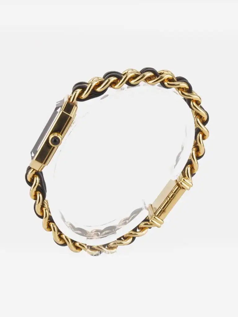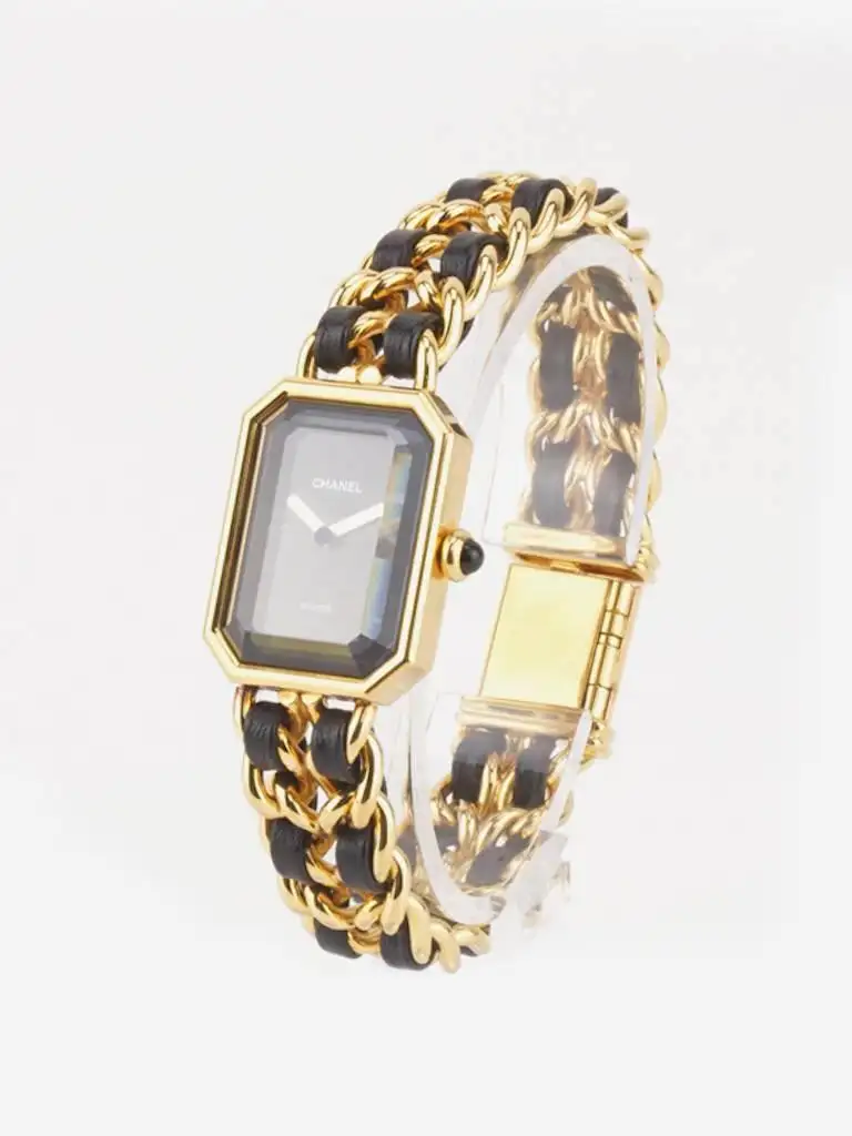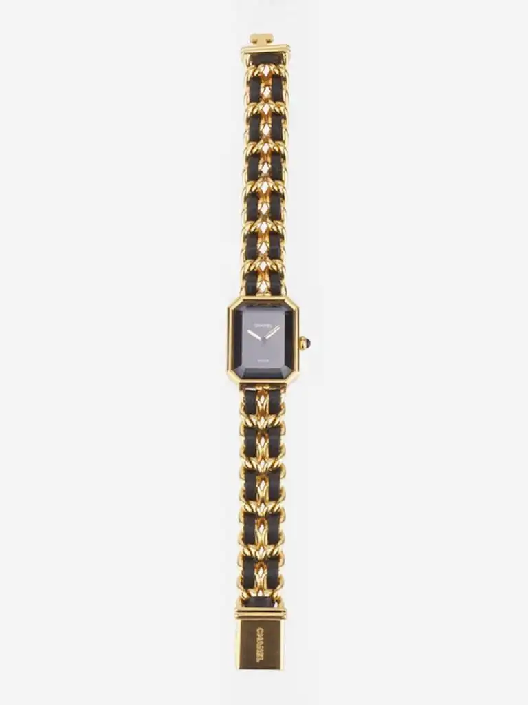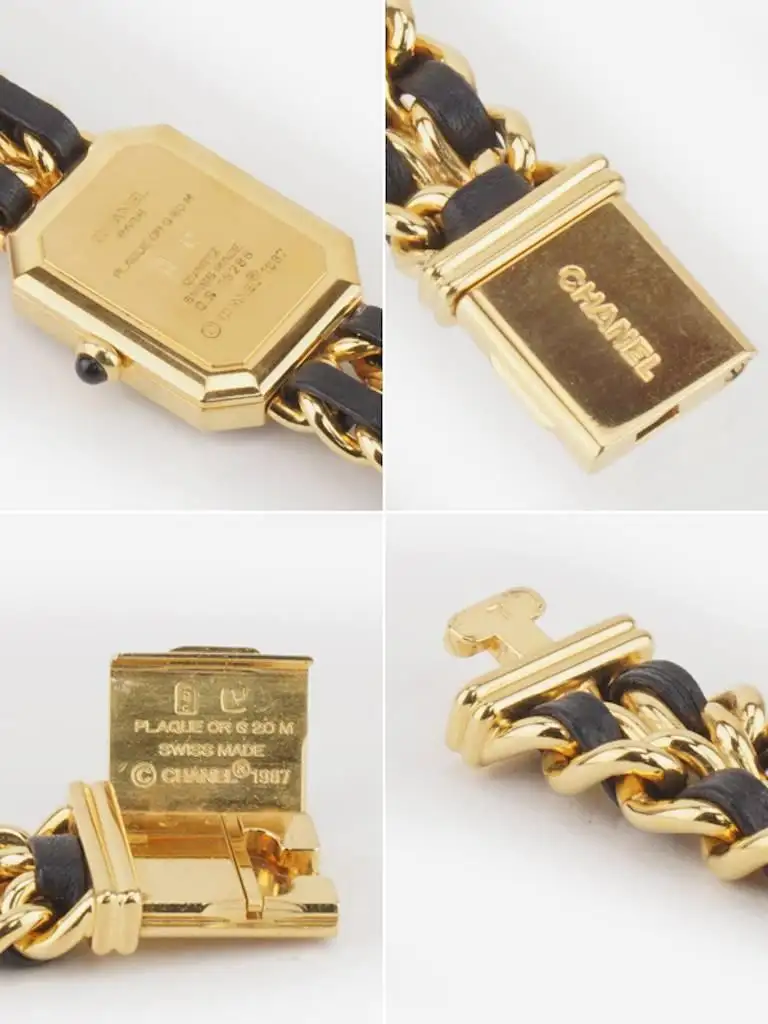 – Vintage 90s Chanel black leather gold plated watch in Size L. This premiere watch is one of the classic style of Chanel.