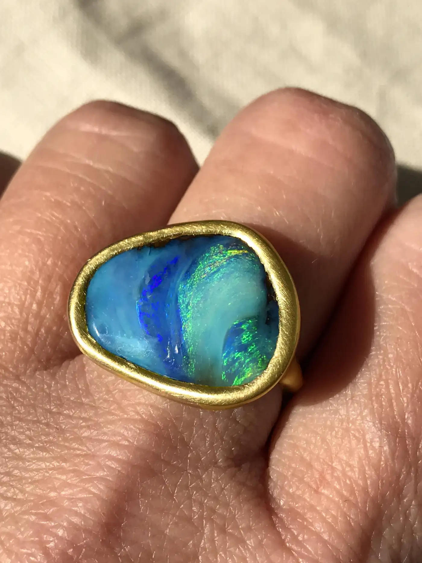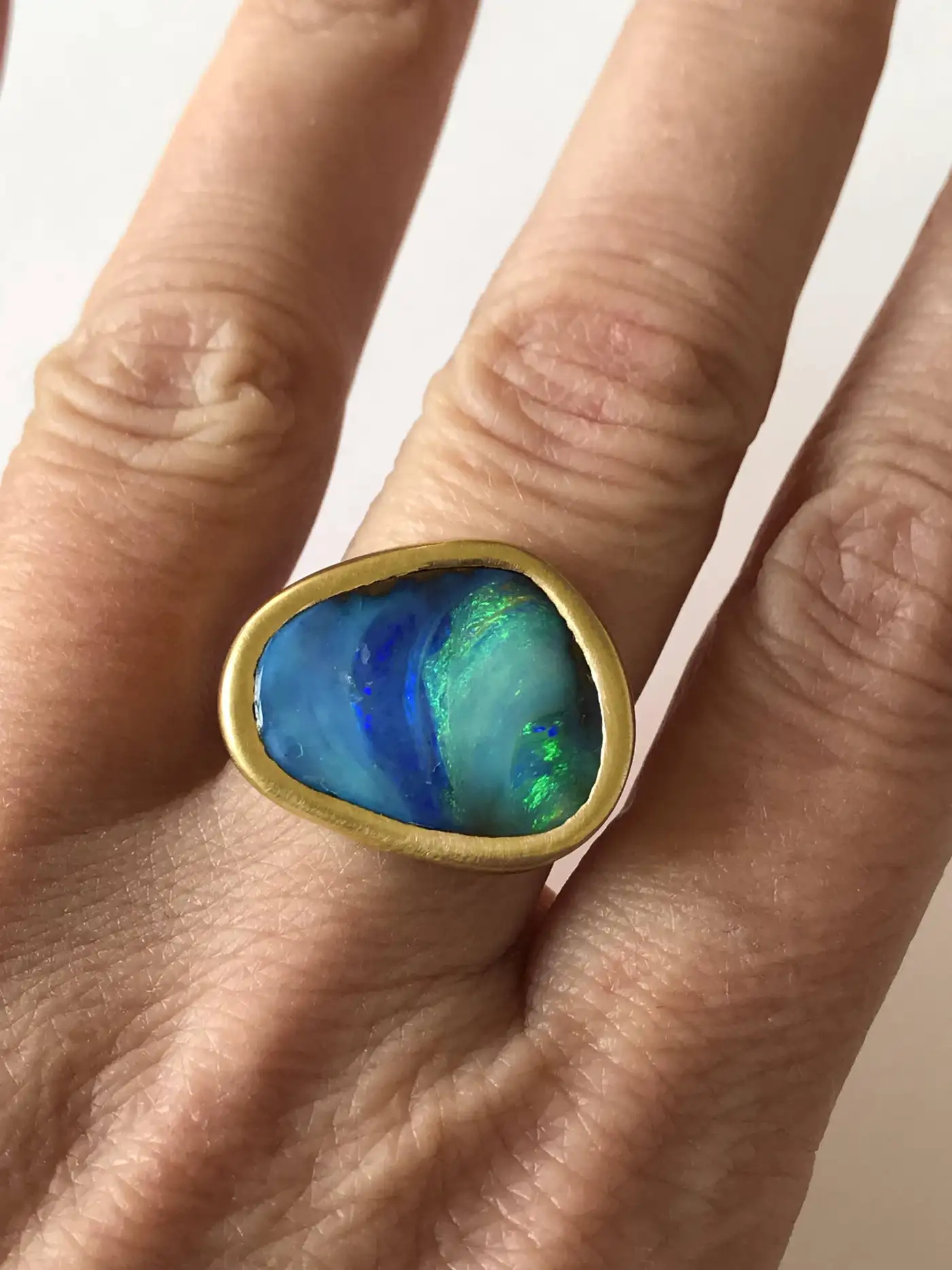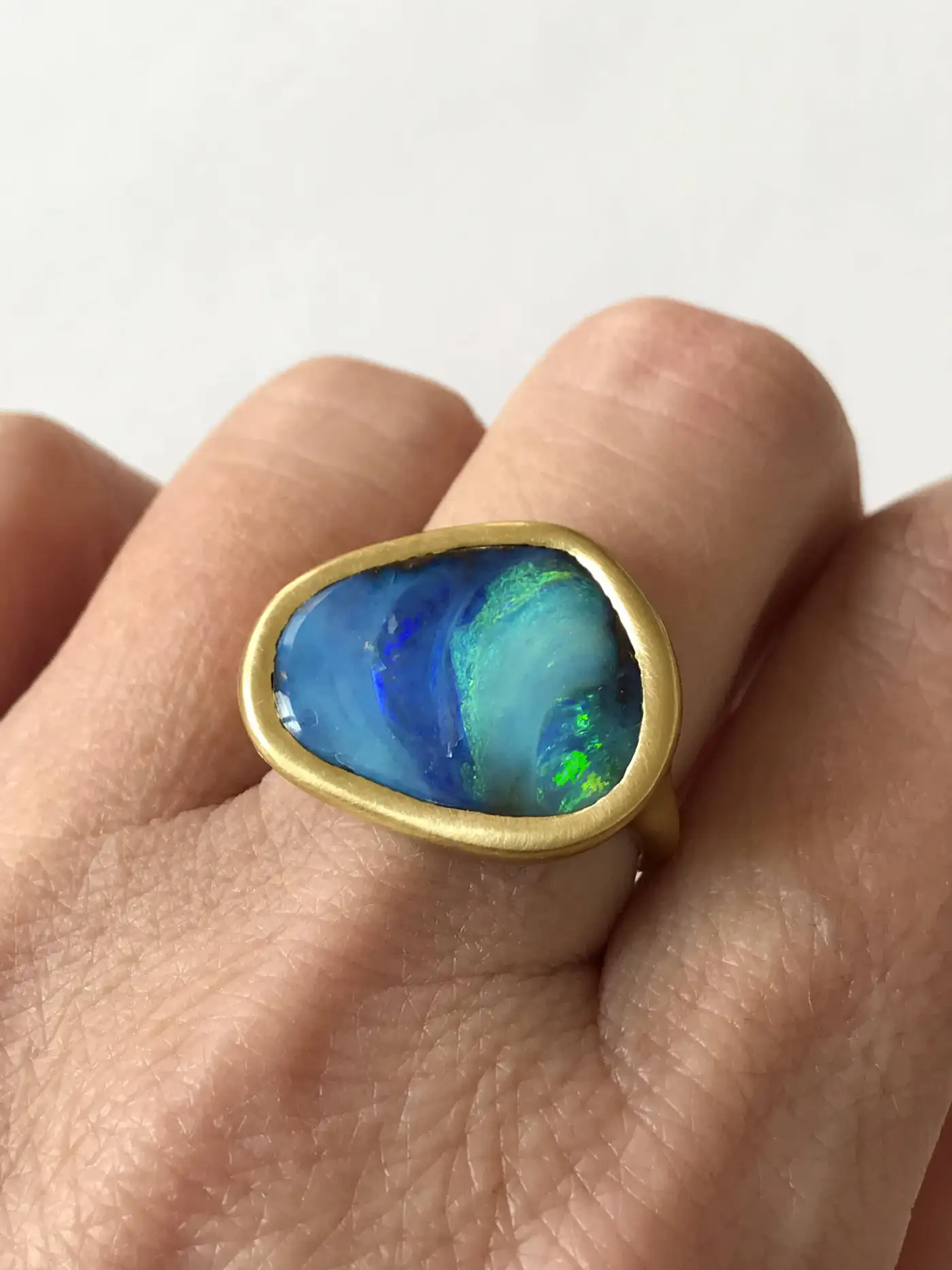 Dalben design One of a kind 18k yellow gold semi lucid finishing ring with a 9,6 carat bezel-set lovely Blue-green Australian Boulder Opal . This Australian Boulder Opal has the seabed colours Ring size 6 3/4 – EU 54 re-sizable to most finger sizes. Bezel setting dimension: width 21,7 mm, max height 17,5 mm. The Ring has been designed and handcrafted in our atelier in Italy Como with a rigorous quality workmanship.