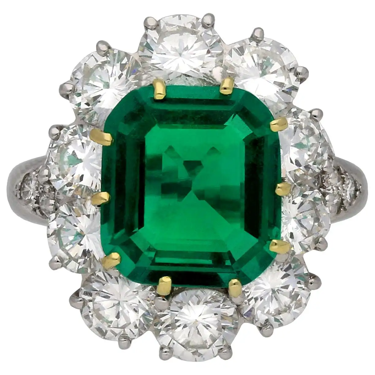 A turn-of-the-century Burmese sapphire and diamond cluster ring, the central round-shaped faceted sapphire weighing 4.84 carats, accompanied by GAGTL certificate stating to be of Burmese origin with no indication of heating, to a graduated cluster surround of old brilliant-cut diamonds, estimated to weigh a total of 2.40 carats, claw-set in silver to a yellow gold mount, to a tapered fluted yellow gold shank with diamond-set shoulders, circa 1900, head measuring 2.1 x 1.6cm, finger size L, gross weight 6.3 grammes. This exceptional ring comes from the collection of Bentley & Skinner, the London jewellers by appointment to both Her Majesty the Queen and His Royal Highness the Prince of Wales. This gorgeous antique piece was made at the turn of the twentieth century and features an impressive deep blue central sapphire. The sapphire is surrounded by an array of scintillating diamonds, which complement the central stone wonderfully. This piece exemplifies the elegance of the early Edwardian period and would make a stunning engagement ring. This ring is in very good condition. The sapphire fine deep blue colour, with sign of a tiny natural fisher to surface. Unmarked tested as 18ct gold and platinum.