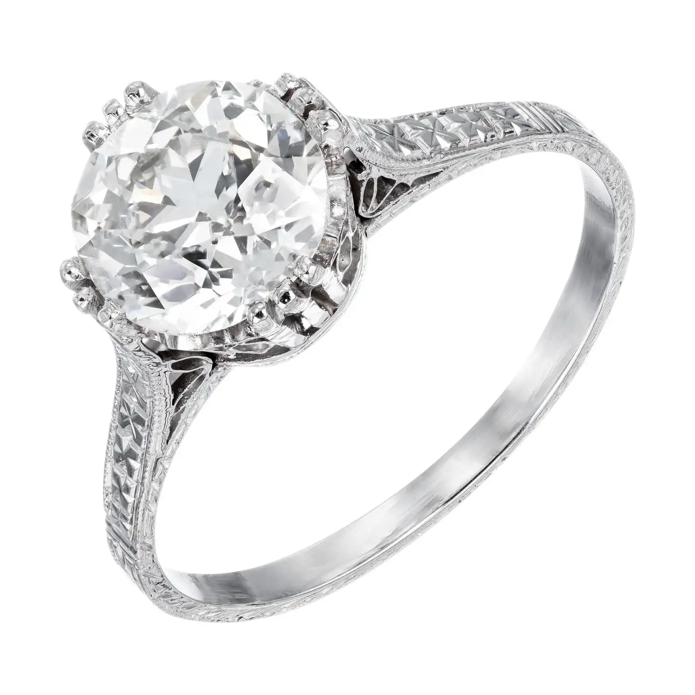 EGL certfied Old European Ideal cut centre diamond in a pierced and engraved platinum setting.
