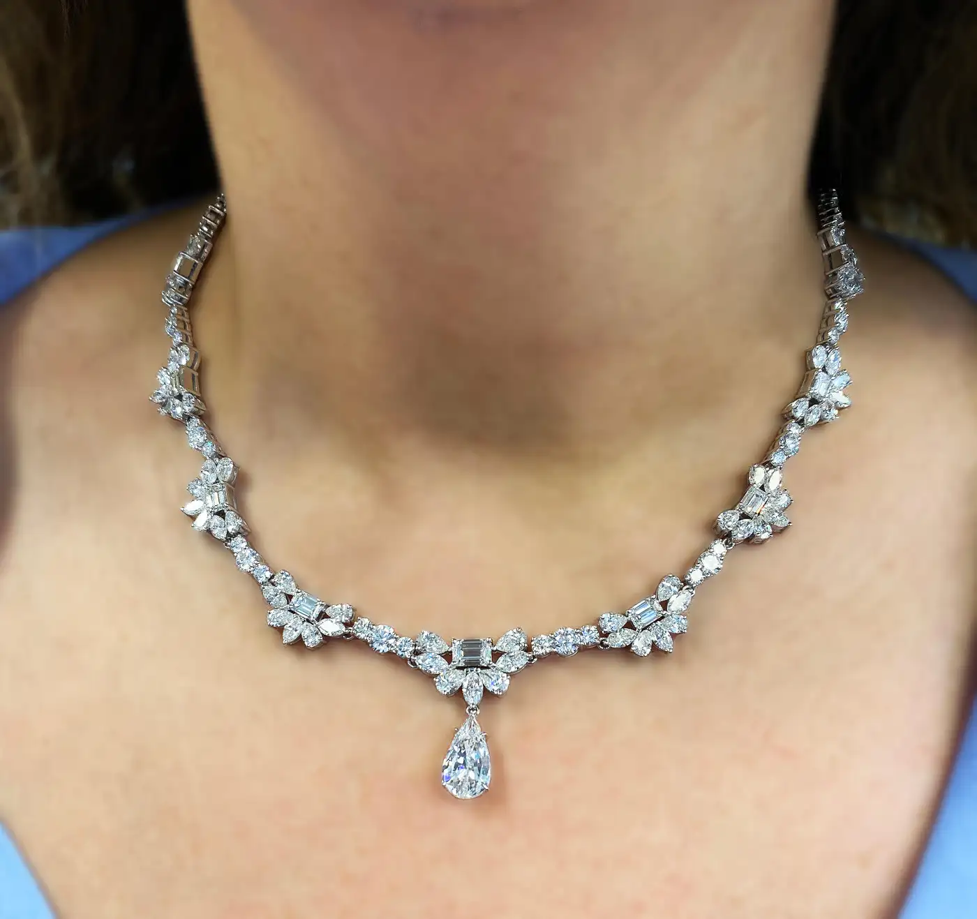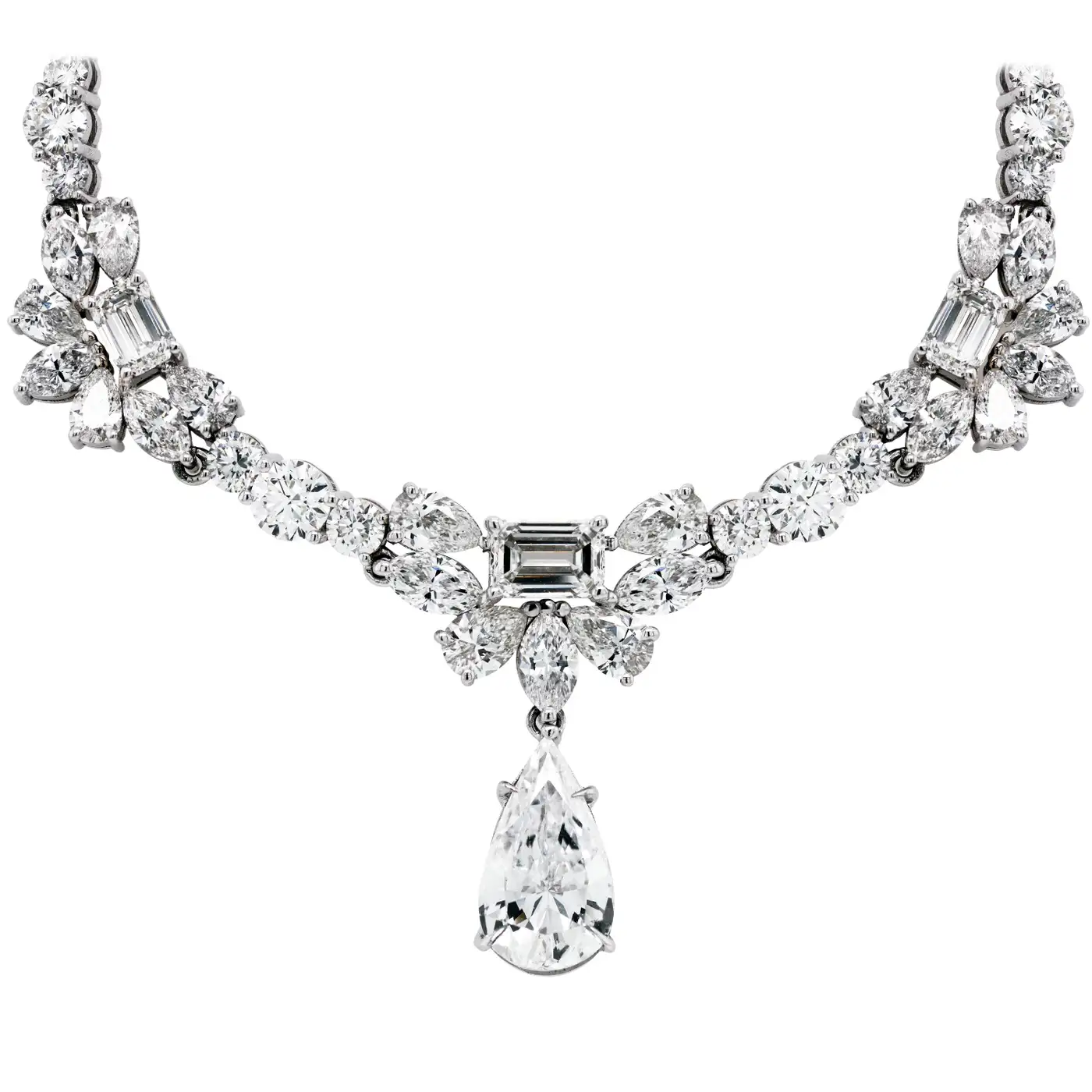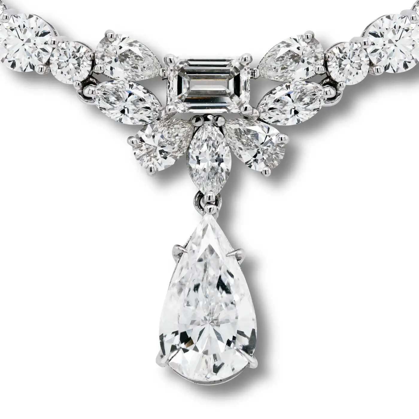 GIA Certified Pear Shape Drop Multi Shape All Diamond Platinum Necklace This one-of-a-kind necklace is exceptional with 29.50 carat diamonds E-F Colour, VVS1-VS1 clarity Pear Shape Diamond Drop is GIA Certified and Laser Inscribed with Report Number: 5192978455 and is D Colour, SI1 Clarity, 3.01 carat Pear Shape Diamond measures 14.06 x 8.06 x 4.39mm