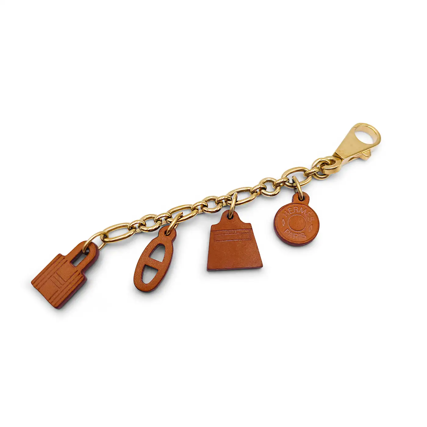 Authentic Hermès Olga bag charm featuring four of the brand’s iconic charms crafted in Barenia leather. The gold-tone chain measures 5 1/2 inches in length. The cadenas lock charm hangs from the last link, bringing the total length of the bag charm to 6 1/2 inches.