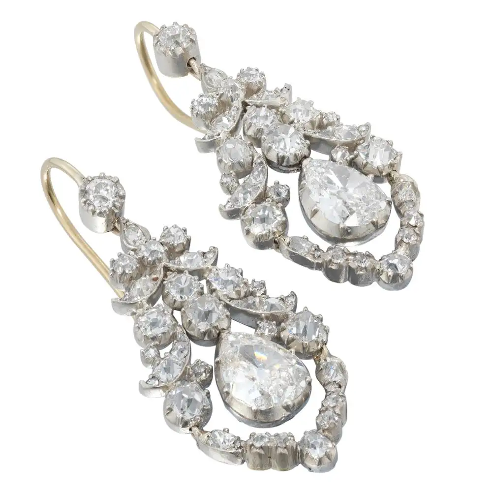 Unmarked tested as 18ct Gold and Silver. Late Georgian earrings in very good condition. A pair of exquisite antique diamond earrings from the collection of Bentley & Skinner, the London jewellers by appointment to both Her Majesty the Queen and His Royal Highness, the Prince of Wales. These ornate, yet refined earrings from the late-Georgian period are wonderfully designed around a remarkable three and a half carat pair of old-cut pear-shaped diamonds. Should you choose to make this purchase we will delighted to send it to you in a Bentley & Skinner handmade leather case packed in a gift-wrapped Bentley & Skinner black and gold presentation box. Shortly afterwards we will send you on a valuation for insurance purposes for your reference and safekeeping.