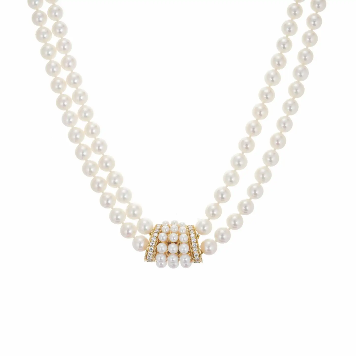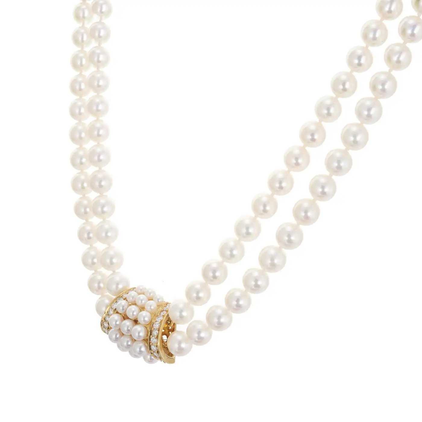 Mikimoto Double Strand Cultured Pearl Diamond Gold Necklace