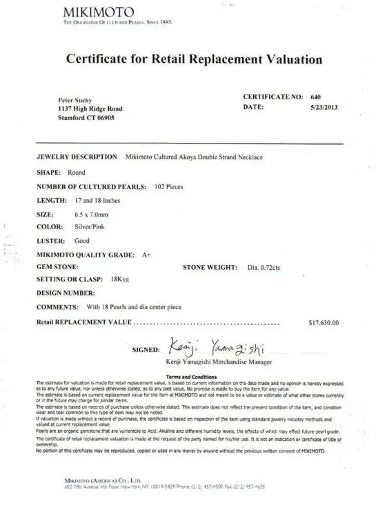 102, 6.5 to 7mm Japanese cultured pearl, silver pink with excellent lustre, A+, Certificate: Mikimoto 640 18, 4.8 to 3mm in clasp Japanese cultured pearls, silver pink, A+, Certificate: Mikimoto 640 22 full cut diamonds, approx. total weight .72cts, F to G, VS, Certificate: Mikimoto 640 Top to bottom: 20.31mm or .80 inch Width: 24.27mm or .95 inch Total length: 17 and 18 inches 62.2 grammes Tested: 18k Stamped: 750 Hallmark: Mikimoto NY