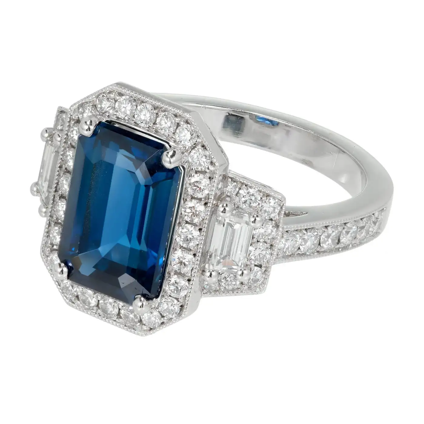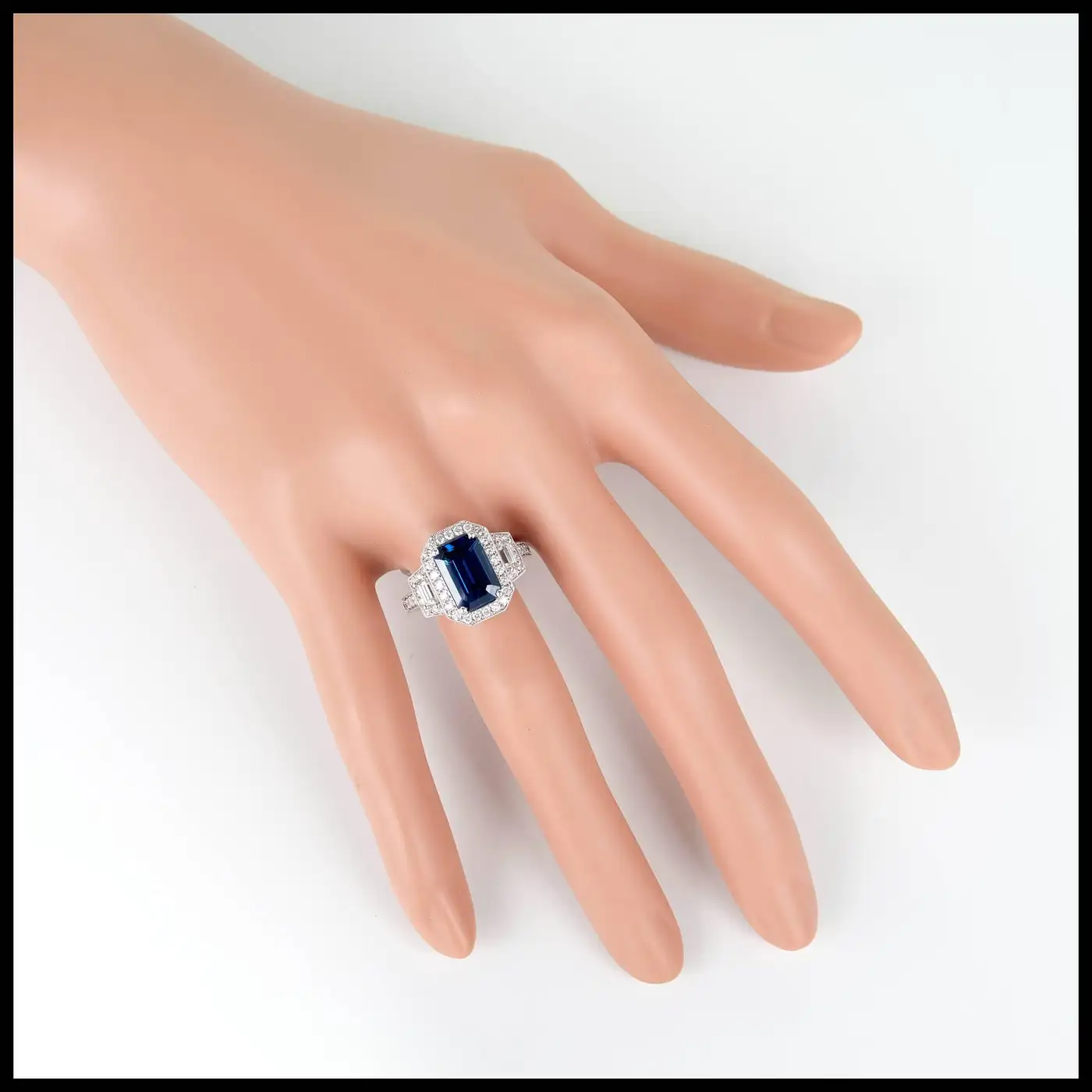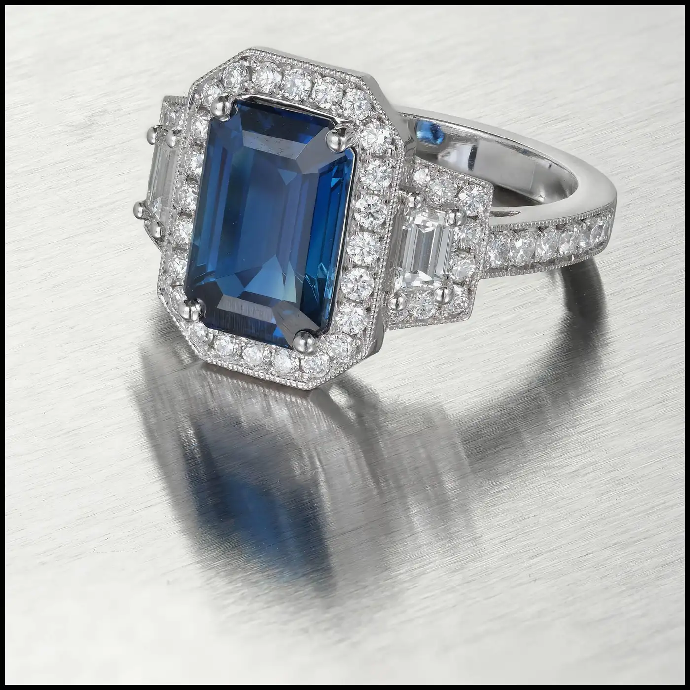 Emerald cut Sapphire and diamond halo engagement ring. GIA Certified centre sapphire with a halo of ideal cut diamonds and two trapezoid cut side diamonds in a platinum setting designed and crafted in the Peter Suchy Workshop.