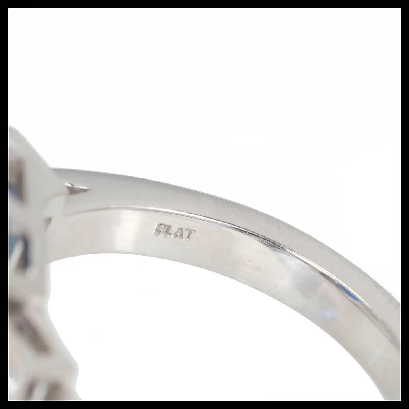 1 old Emerald step cut deep cornflower blue natural Sapphire, approx. total weight 3.88cts, VS2 – SI1, 10.56 x 7.21 x 4.71mm, simple low level heat only, GIA certificate #2165127797 2 trapezoid cut diamonds, approx. total weight .36cts, E-F, VS 58 58 Ideal full cut diamond, approx. total weight 1.06cts, E-F, VS Size 6.25 and sizable Tested: Platinum Stamped: Plat Width at top: 14.6mm Height at top: 7.2mm Width at Bottom: 2.4mm 9.2 grammes.