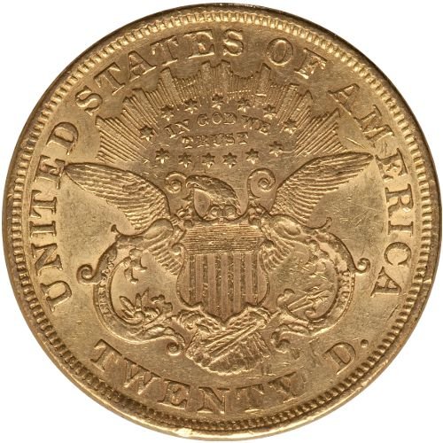 The $20 Liberty Gold Double Eagle was designed John B. Longacre. The front of the coin features his Crowned Liberty portrait, earning it the alternative titles of “Liberty Head Double Eagle” and “Coronet Double Eagle.” The portrait depicts Lady Liberty, wearing an inscribed tiara. She is encircled by a series of stars in honor of the original 13 colonies. Longacre drew his inspiration for his artwork from the royal effigies featured on ancient Greco-Roman currency.