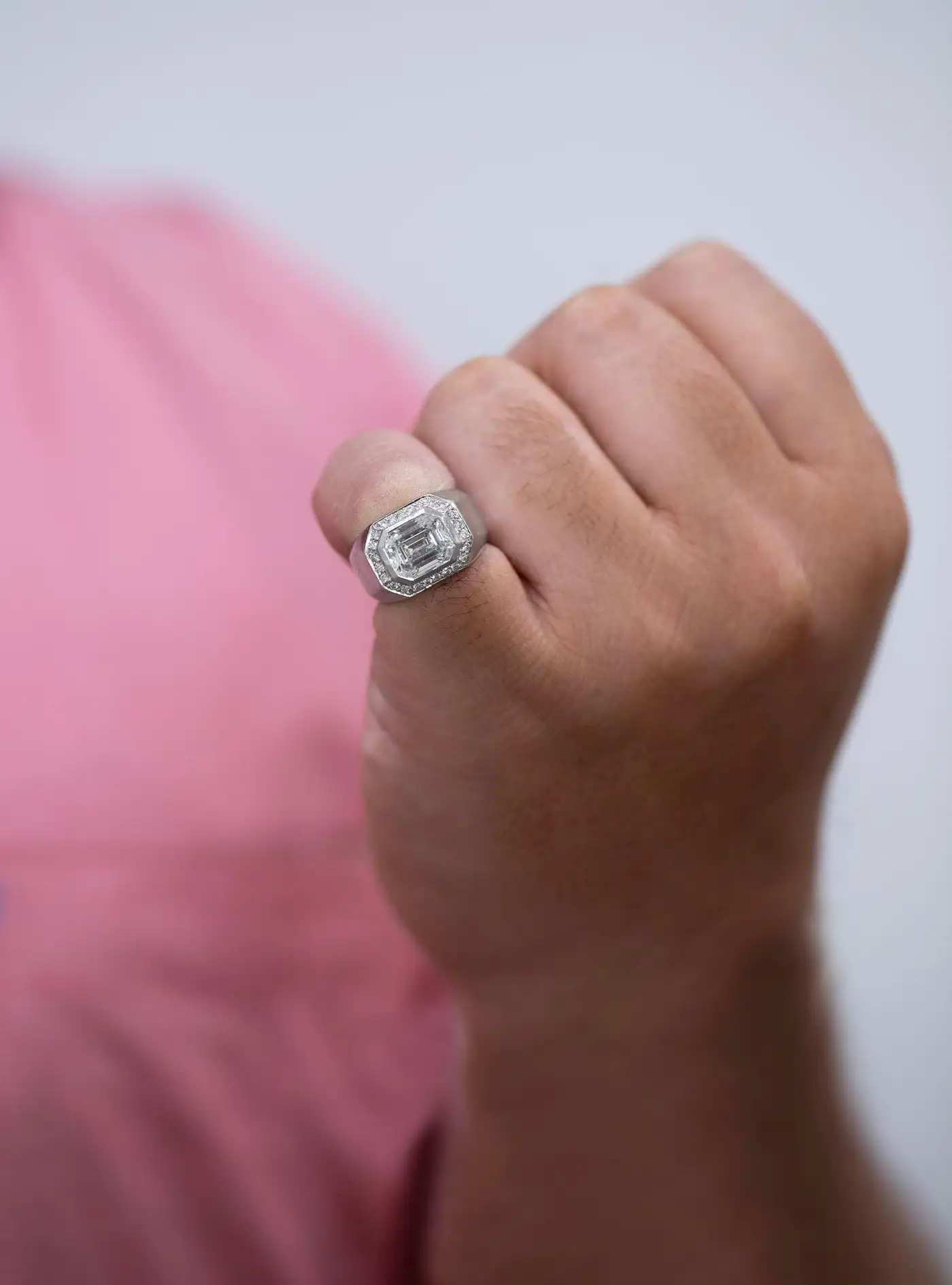 A marvellous mens ring features a dazzling bezel set GIA Certified 3.14 carat emerald cut diamond, H Colour and IF in Clarity. Surrounded in an outer halo design by a row of round diamonds weighing 0.30 carats. Matte finish, Made in 14K White Gold, Size 6.5 US.