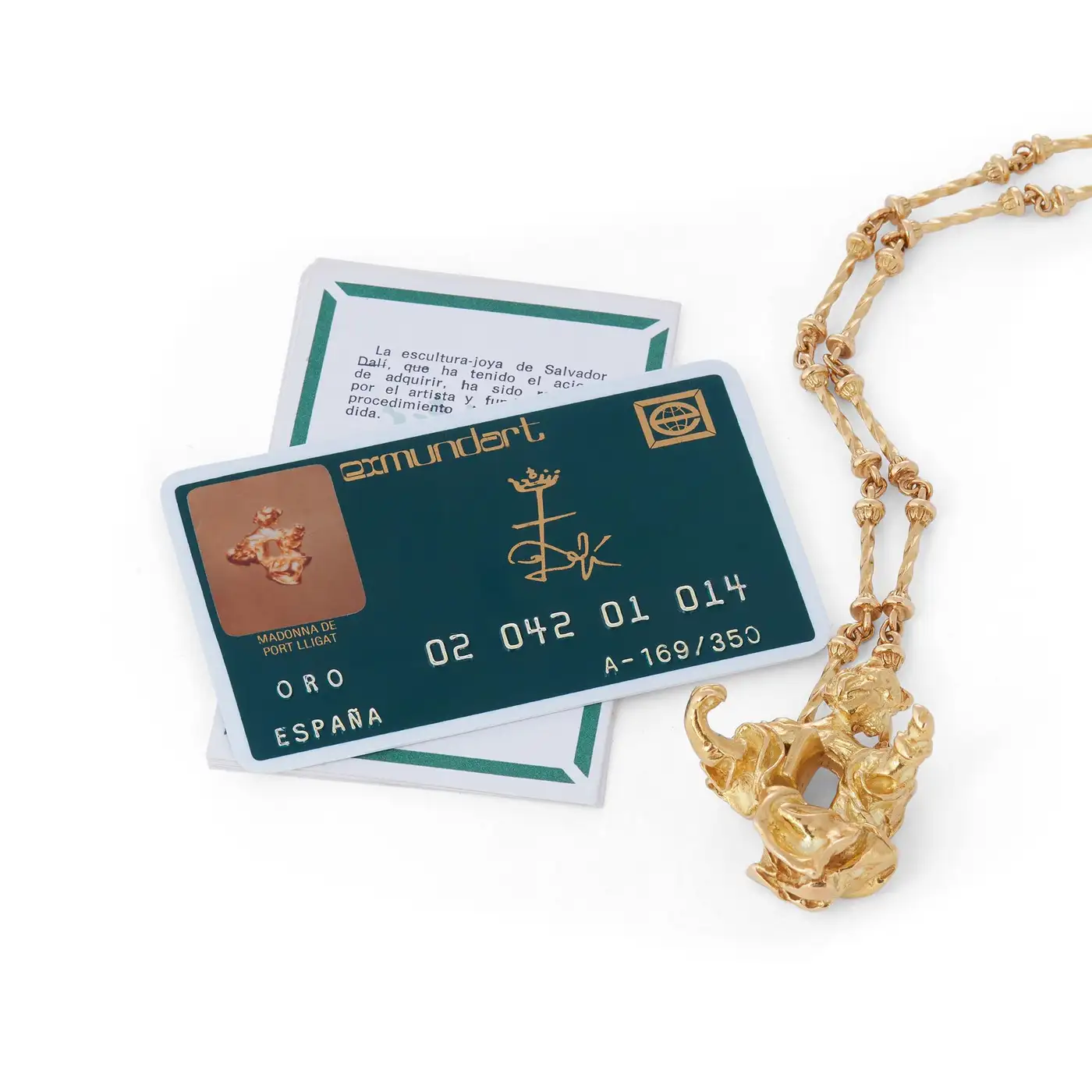 Authentic limited edition Salvador Dalí Madonna de Port Lligat necklace crafted in 18 karat textured yellow gold. The artist’s depiction of the Madonna is represented here in a solid gold pendant measuring approximately 1.67 inches long and 1.34 inches wide. The necklace measures 16 1/2 inches with an 11 3/4 inch extender for a total wearable length of 28 1/4 inches. Signed Dalí with serial number. Necklace is presented with the original box and authenticity card. CIRCA 1970s