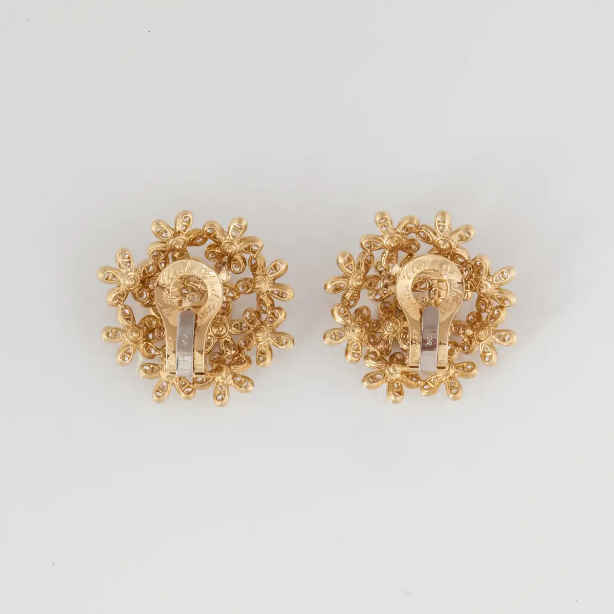 Van Cleef and Arpels 18K yellow gold earrings from the Socrate collection. The earrings feature 264 round diamonds totaling 7.02 carat, F-G colour and VVS-VS clarity. They are marked “ML7527 Van Cleef & Arpels 750”. The earrings measure 1.25 inches wide and have clip backs.