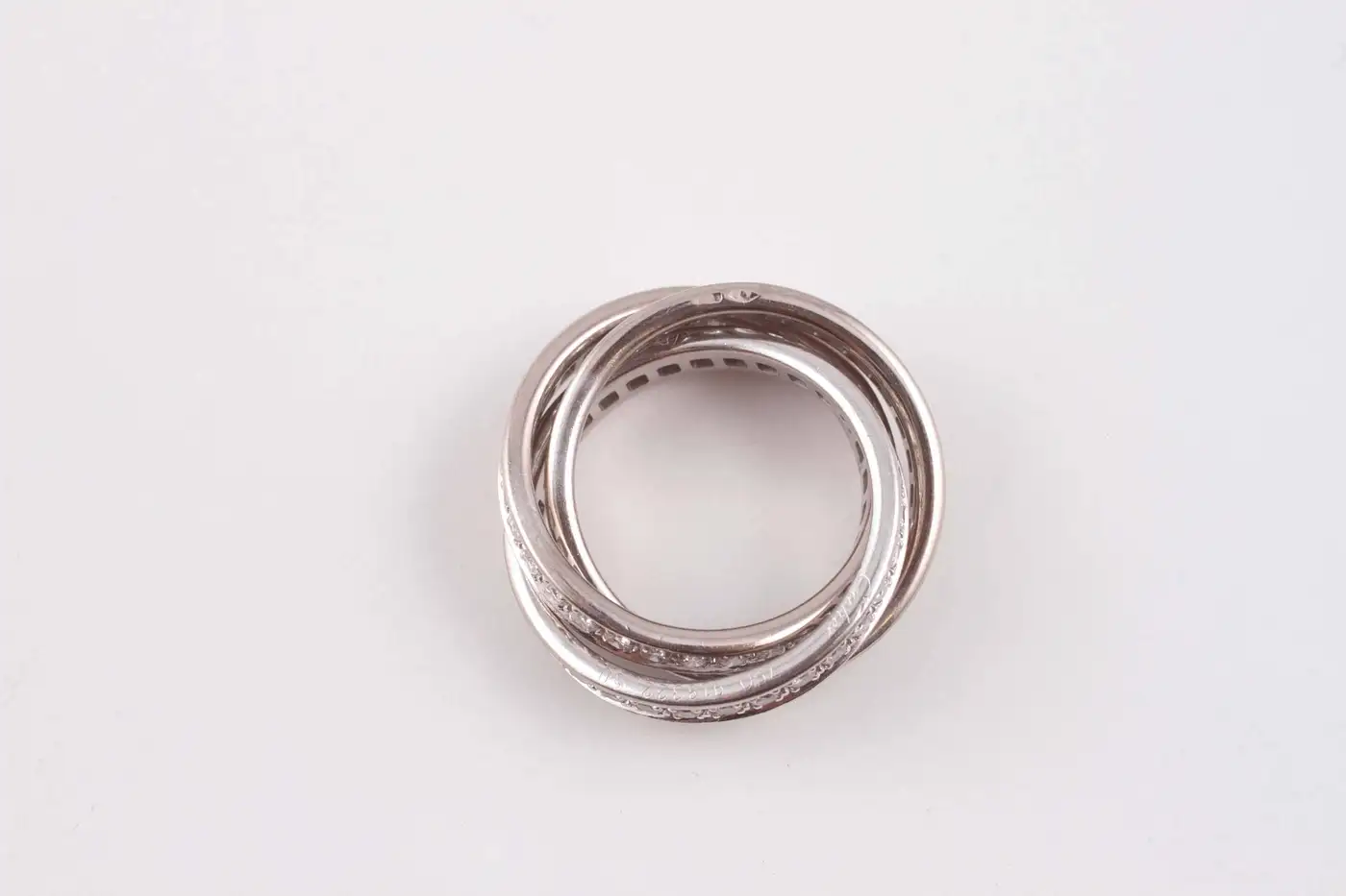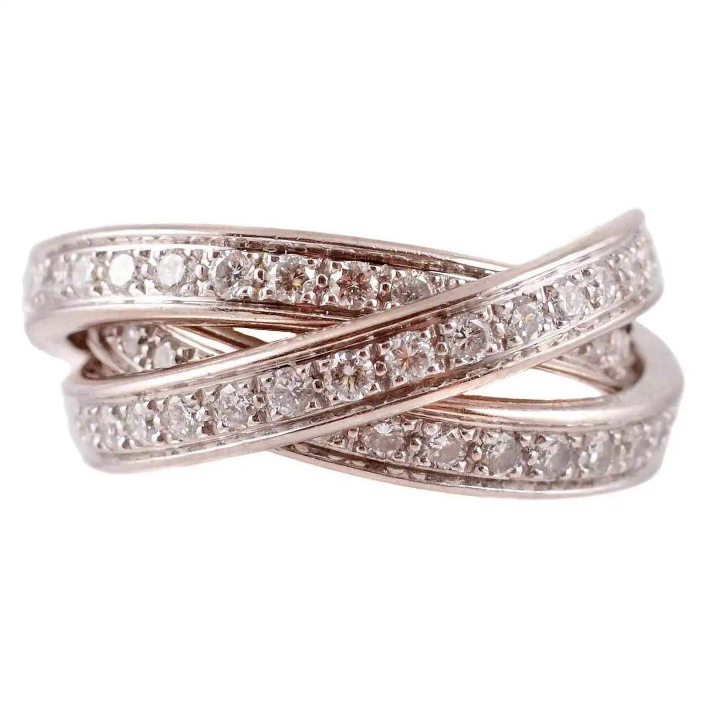 Classic and lovely! This Trinity de Cartier ring is composed of 18 karat white gold, supports 1.00 ct of diamonds and is a size 4 1/2.
