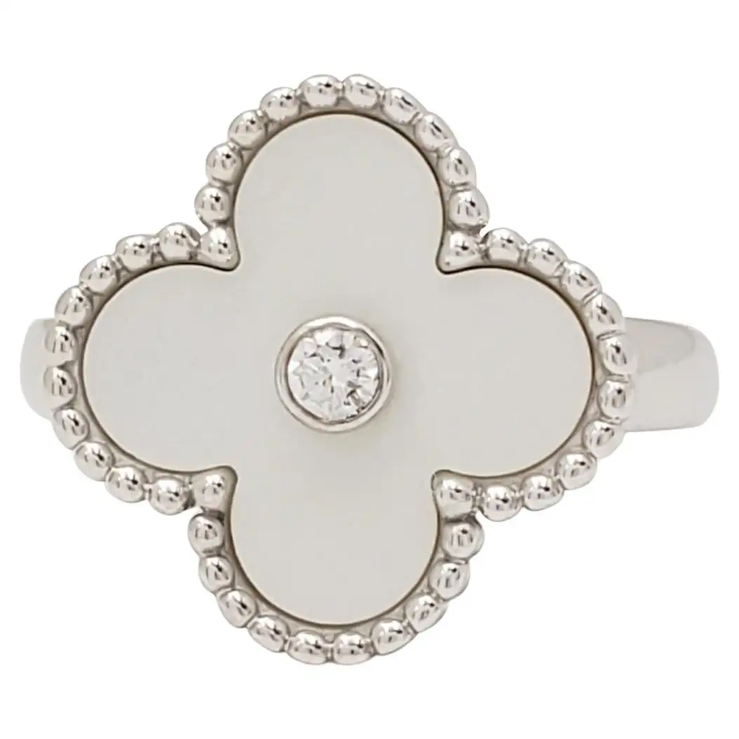 Authentic ‘Vintage Alhambra’ ring crafted in 18 karat white gold centres on a clover motif in mother-of-pearl set with a round brilliant cut diamond centre weighing an estimated 0.06 carats (E-F colour, VS clarity). Signed VCA, Au750, 48, with serial number. Ring size 48 (US 4 1/2).